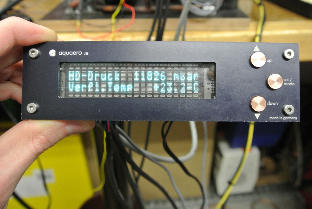 Als Steuerung sollte eigentlich das Aquaero 5 zum Einsatz kommen, allerdings waren die angezeigten Temperaturen im Minusbereich komplett unbrauchbar. Die Abweichung zur tatsächlichen Temperatur lag bei bis zu 17,5K. -27,5°C hat das Aquaero als -45°C angezeigt. Bei -25°C betrug die Abweichung noch 16K (-41°C).