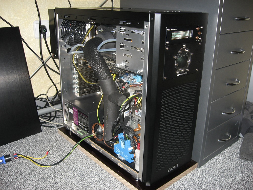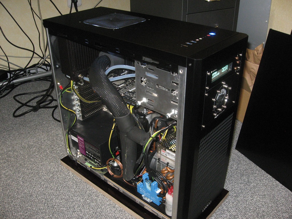 Daher fiel die Wahl auf das Lian Li PC 9F. Bei diesem Gehäuse hat man mit demontiertem Festplattenkäfig eine Menge Platz in der Front. Zudem sitzt das Netzteil unter dem Mainboard und man hat dadurch unter der Grafikkarte genug Platz für den Einbau der Kokü.