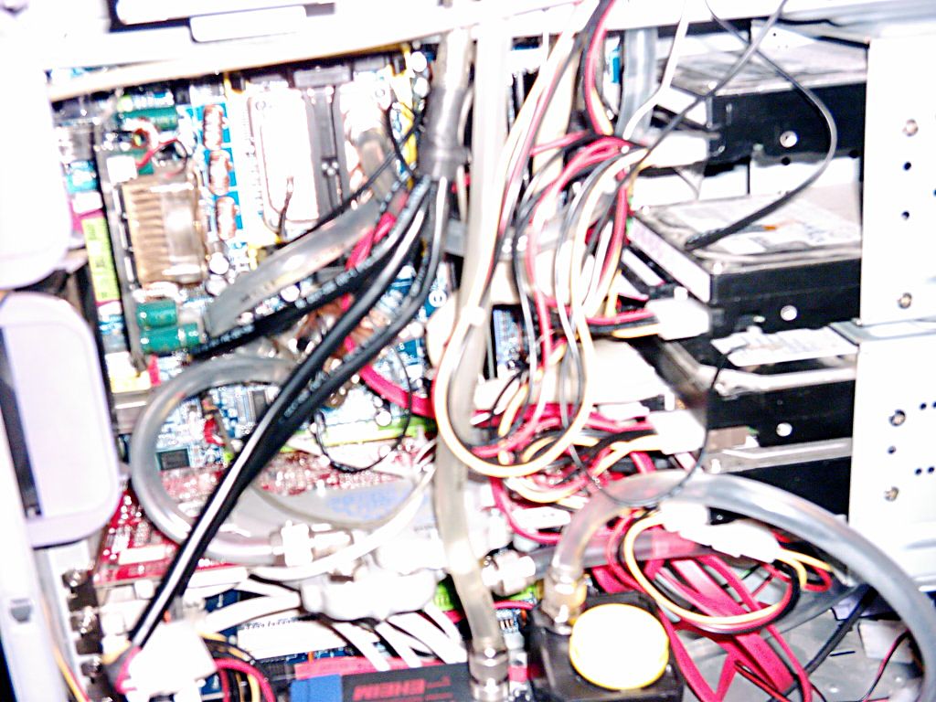 Dem GraKa-Kühler hab ich den hinteren Acetal-Block geklaut, damit liegen die Schläuche für den CPU-Kühler schön in dem