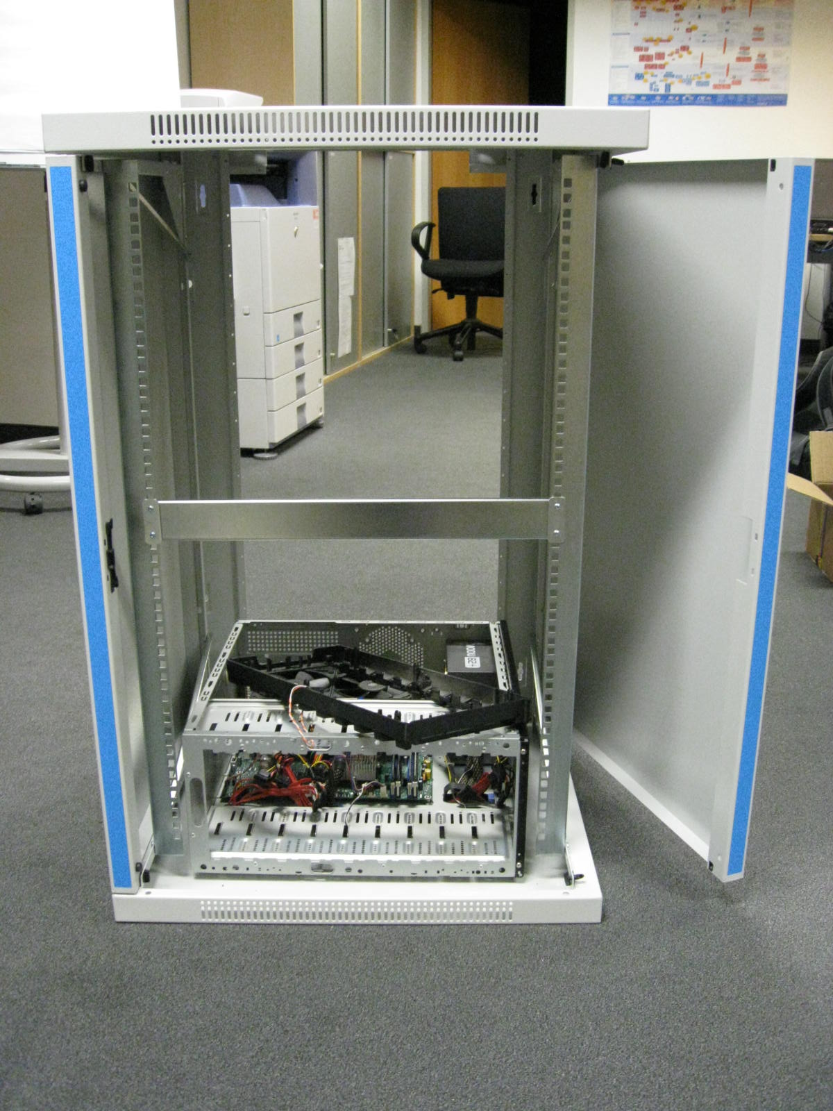 ATX-Gehäuse mit 9 x 5,25"-Einschüben wird nicht stehend, sondern liegend (wie es halt bei 19" normal ist :) ) in das Rack gestellt.