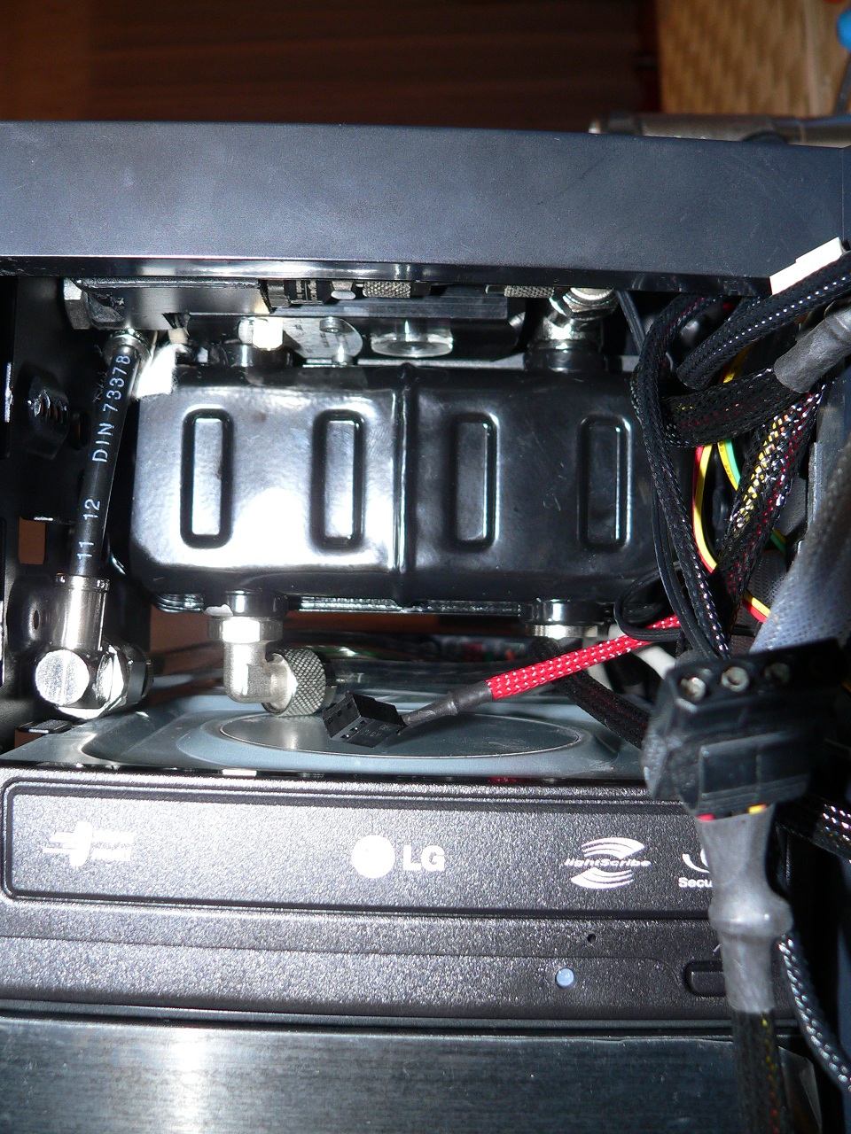 Die Pumpe ist im eigentlichen Festplattenkäfig untergebracht. Da dieser mit Gummitüllen versehen ist, ist die Pumpe durch die Gummipuffer gleich doppelt entkoppelt ;)