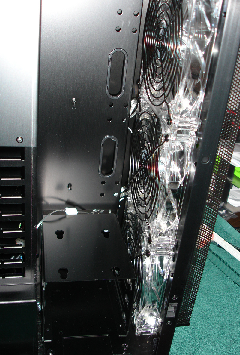 Nach dem Einbau der Hardware wird klar, wie ungeeignet der Tower für den Einbau von Waküs ist. Seht selbst. Um einen 420er-Radi an diese Front-Lüfter zu kriegen, muss ich unten die Schiene für den Festplattenkäfig herausbohren - und selbst dann ist nicht gesagt, dass der 420er wirklich passt. Das ist ein Problem ...