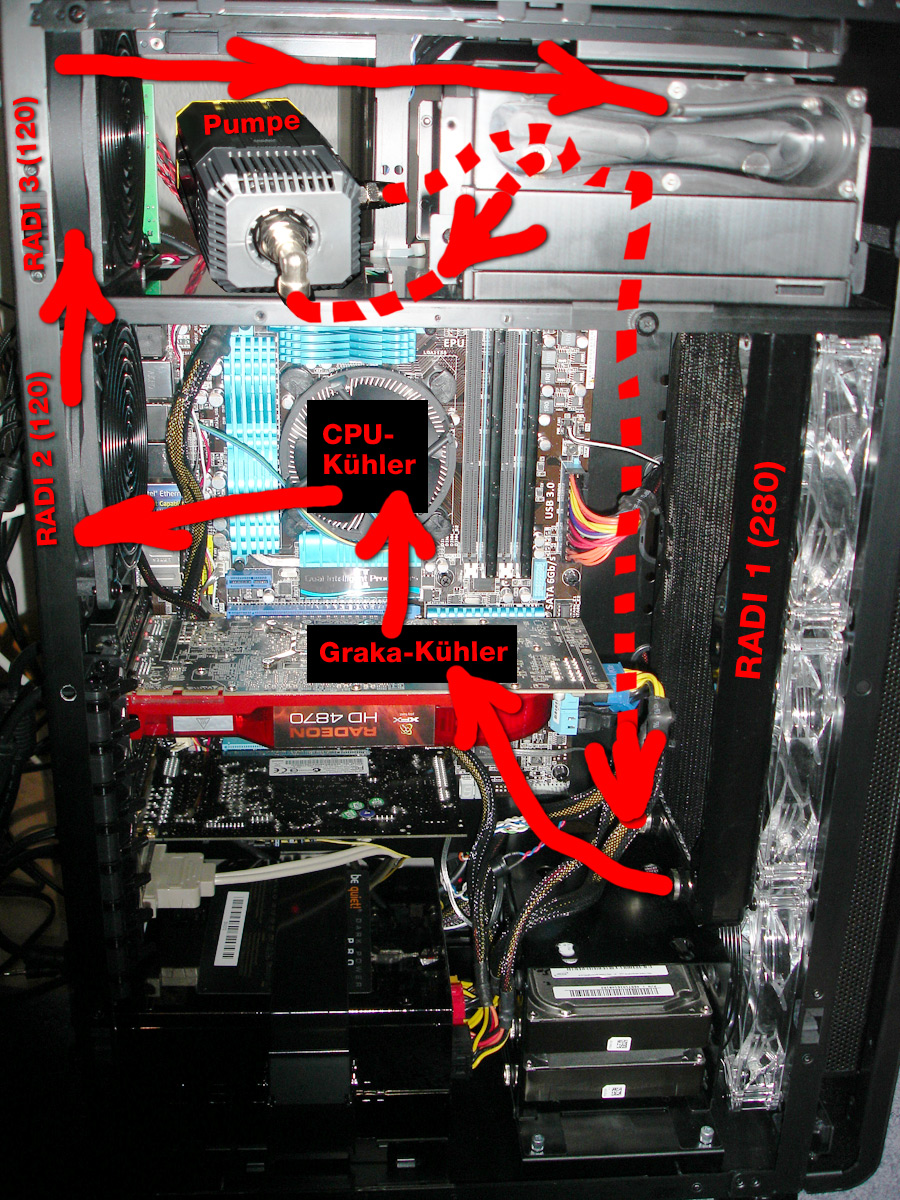 Ich hab weiter rumgetüddelt und geplant. Auf dem Foto habe ich grob eingezeichnet, wie ich mir das System vorstellen könnte (die gestrichelten roten Linien deuten an, dass die Schläuche rechtsseitig, mit Winkelverbindungen nah an der rechten Seitenwand entlang laufen). Eigtl. spricht es eher dafür, die Pumpe oben einzubauen. Was schwierig wird (Bohrungen, Vibrationen, etc). Unten wird's eng, aber auch möglich, schätze ich. Die zwei 120er werden AUßEN angebracht und quer angeschraubt (auf dem einen Bild hab ich mal ein altes Schrottteil drangehalten). Leiderleider ... :( Die hinteren Schlauchausführungen seht ihr auf dem letzten Pic.