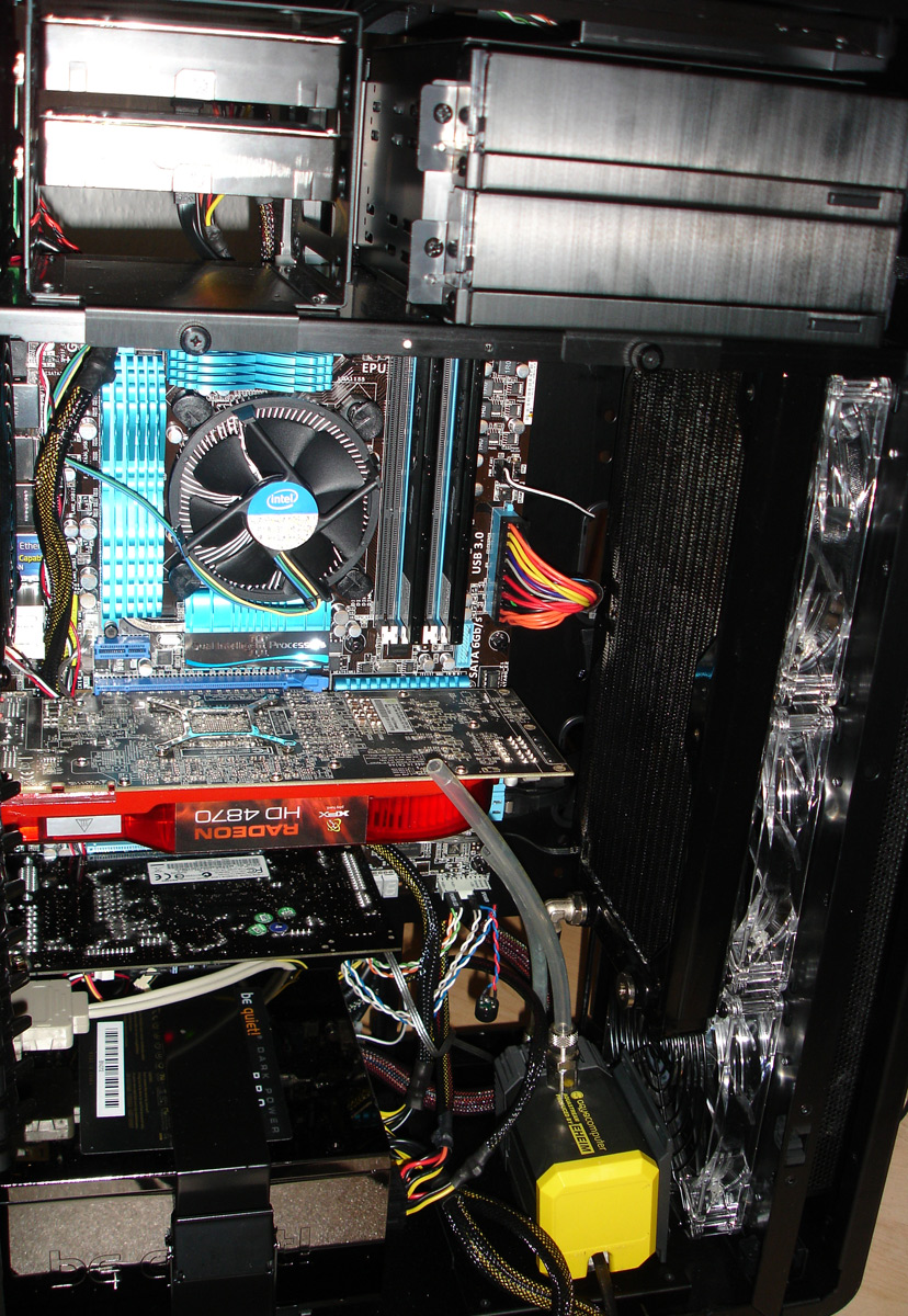 ... selbst wenn ich dort nen 420er unterbringe, muss an dieser Stelle die Pumpe stehen. Nächstes Problem: Die Kabel aus dem Netzteil berühren sicher irgendwie die Pumpe und nehmen vermutlich Vibrationen auf. Das wäre das zweite Problem ...