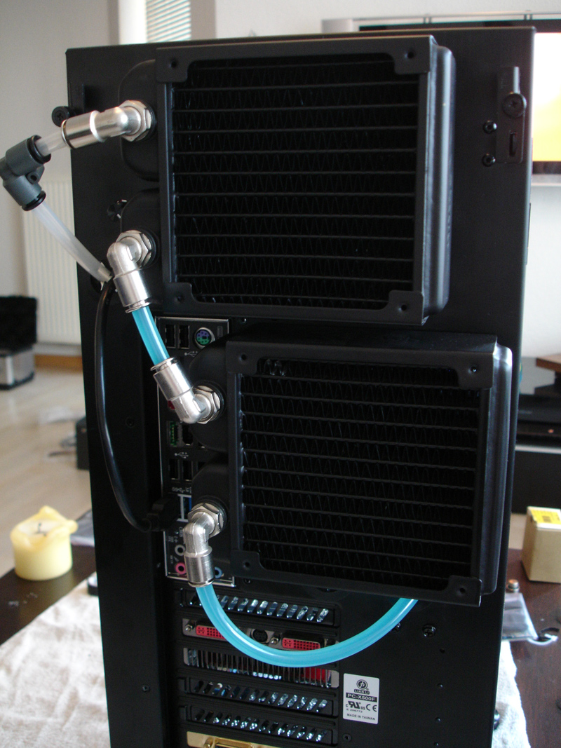 In Kürze wird mein Lian Li PC-A77F (280er im Deckel, 120er hinten außen) durch ein Lian Li PC-X500FX ersetzt. Das PC-X500FX ist das Nachfolgemodell zum X500, aber ähnlich schwierig beim Einbau einer Wasserkühlung zu handhaben. Eindrücke: http://bit.ly/i6RyUV Schön, nä? ^^