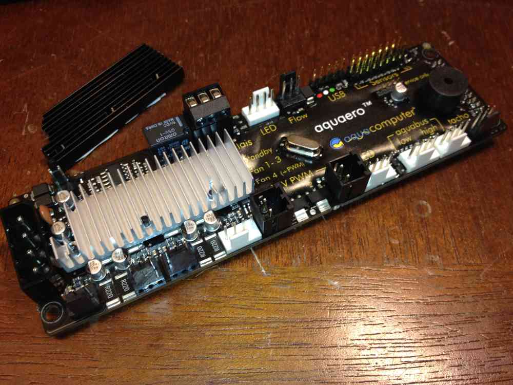 Habe mitte des Jahres auch das neue Aquaero gekauft. Da in dem Shop noch ein zusätzlicher Kühlkörper für das Aquaero5 zu kaufen war, habe ich mir dieses gleich mit bestellt. Erstaunt war ich schon, als der schwarze Kühlkörper, den ich ja zusätzlich gekauft habe, schon auf dem Teil montiert war... Also weg damit.