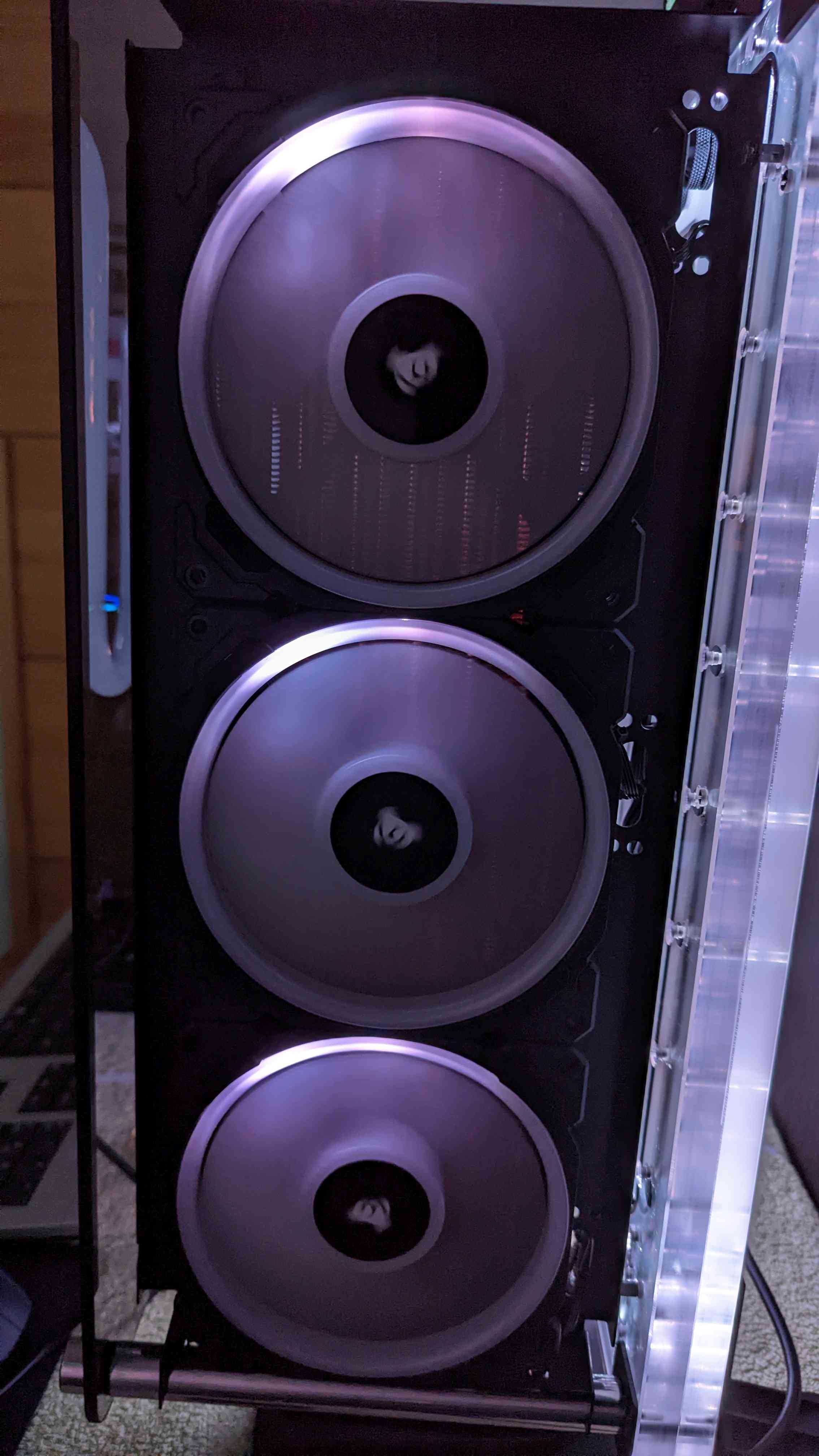 ▪ Diverse Anzeigeelemente und RGB-Leuchteffekte▪ Aquacomputer Komponenten: Leakshield, D5 Next, Highflow Next, 2x Vision RGBpx, CPU Kühler mit 925er Silber Acryl und Vision, 420er Radiator Kupfer, Farbwerk 360, Hubby7
