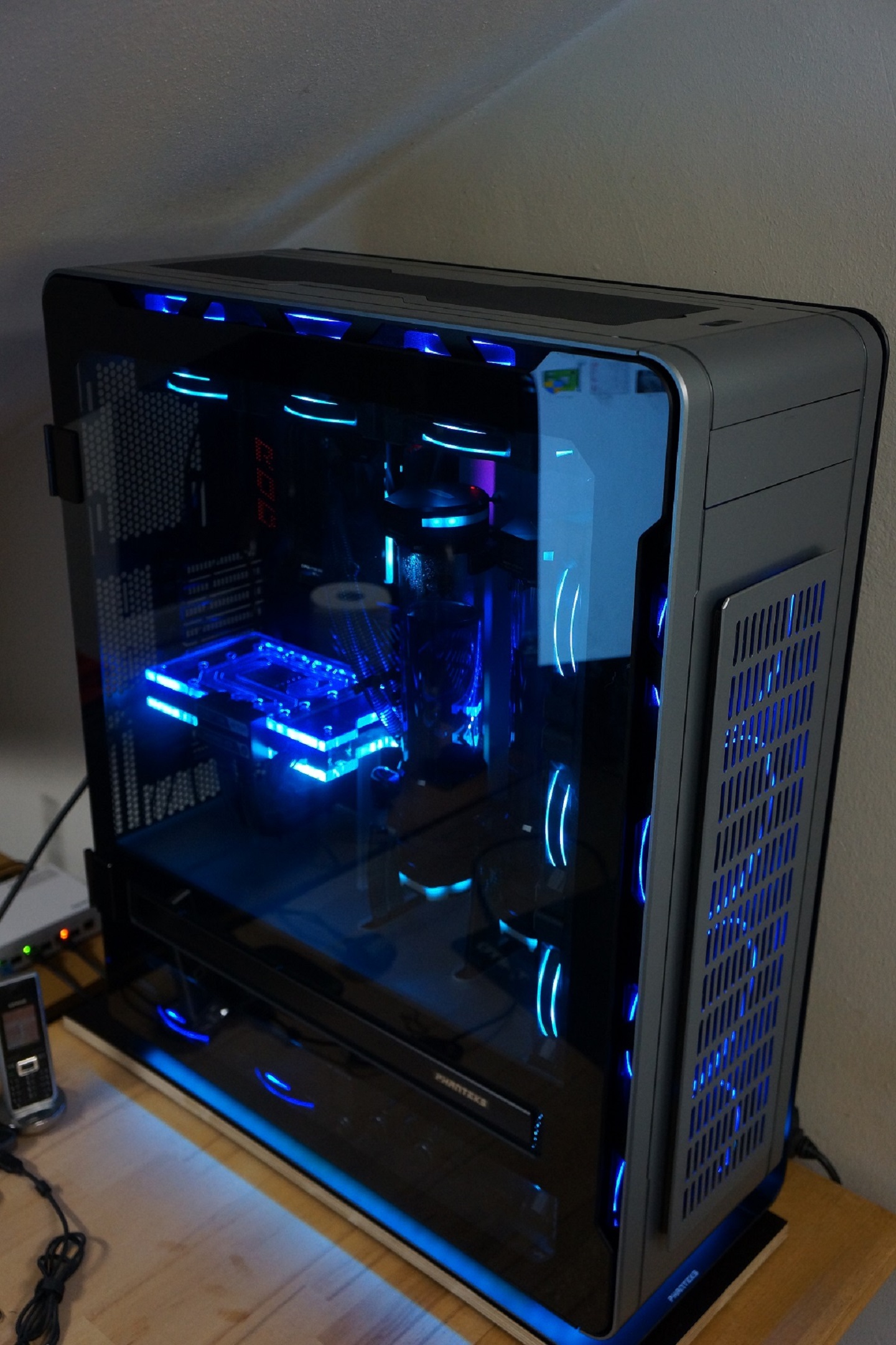 Angefangen beim Case, ein Enthoo Elite mit nicht originalem Ausschnitt in der Front um dem 560er Radiator das Atmen