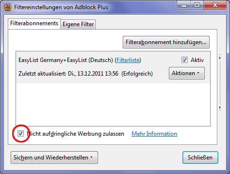 Gibt mit der Version 2.0 eine mehr oder minder bedeutsame Neuerung, was den bekanntesten Werbeblocker betrifft. Mit dem heute erschienenen Update ist AdBlock Plus so eingestellt, dass "nicht-aufdringliche Werbung" standardmäßig durchgelassen wird. Das lässt sich aber im Einstellungsmenü von Adblock Plus per Häkchen abschalten.