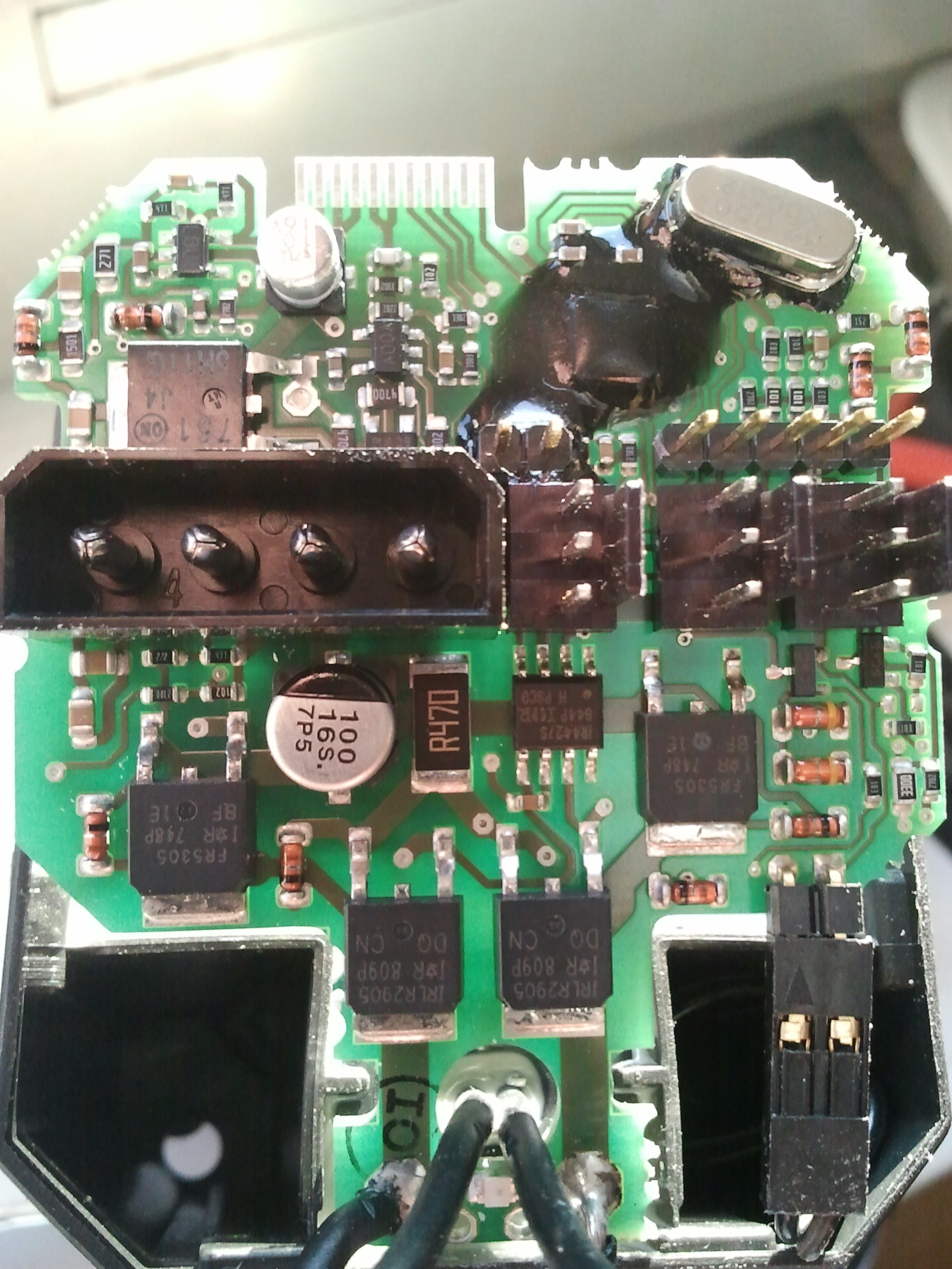 Auf dem ersten Bild oben, bisschen rechts - Das "schwarze" Teil sieht ziemlich verkohlt aus, würde fast sagen, dass da mal ein Kurzer drauf war.
