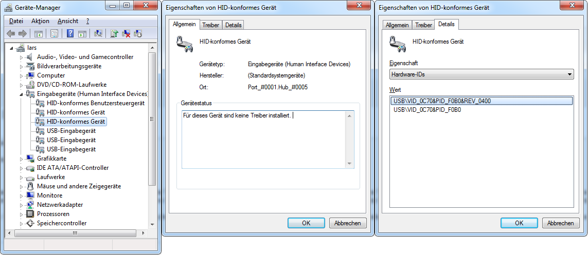 Ich habe 4 Intel USB-Prots getestet, alle verhalten sich gleich: Das aquaero wird als aquaero 4.00 (0C70 F0B0) erkannt und automatisch der Treiber "USB Eingabegerät" installiert. Der zeigt mit gelbem Ausrufezeichen: "Das Gerät kann nicht gestartet werden. (Code 10)". Wenn ich dann manuell den Treiber auf "HID konformes Gerät" ändere verschwindet das gelbe Ausrufezeichen und der Status wird zu: "Für dieses Gerät sind keine Treiber installiert.". Neustarten mit und ohne aquaero am USB, nachträgliches anstecken, Anschluss wechseln hilft nicht. Updates, Treiber und Bios sind aktuell. Das aquaero lässt sich am Gerät selbst ganz normal bedienen und scheint normal zu arbeiten.