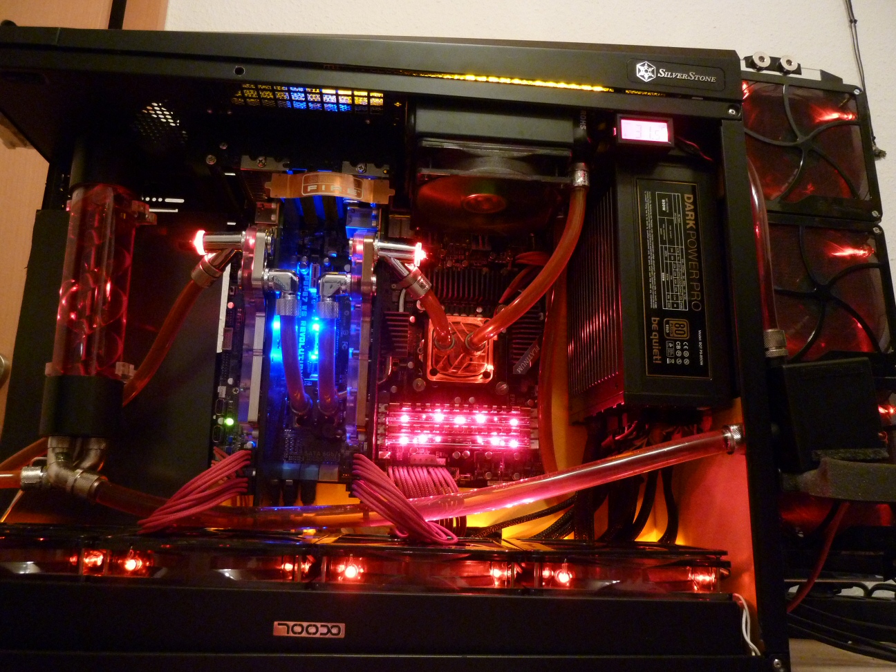 Die Pumpe ist genial,mit einem Lichtwellenleiter hab ich das blinken der led weitergeleitet so daß ich es von außen shen kann,hinzu ist noch eine Lian Li Kugel Pumpe mit extrernem Netzeteil falls mal eine Pumpe ausfällt,der interne und der extrerne Temperatursensor,dazu die durchflussüberwachung, die lüftersteuerung dann ist sie auch noch extrem leise und man kann die taktrate wählen alles über die kostenlose software ,oben in dem corsaier gehüse sitz ein aquacomputer 420/360 mit 3 lüftern die mit magneten gehalten sind es sind 38x120 er lüfter von arctic colling das ganze ist so leise daß man den ganzen rechner nicht hört,dazu hab ich nen riesen passiven kühler gebaut,dazu halt 2 pumpen im system, die aquacomputer ist so gut daß ich keine zusätzliche überwachungsanlage brauche, da hat man alles in einem für den preis einfach hammer,zumal man sie auch von der normalen auf die ultra einfach mittels eines schlüssels den man käulich für 10 euro erwerben kann aufrüsten kann.