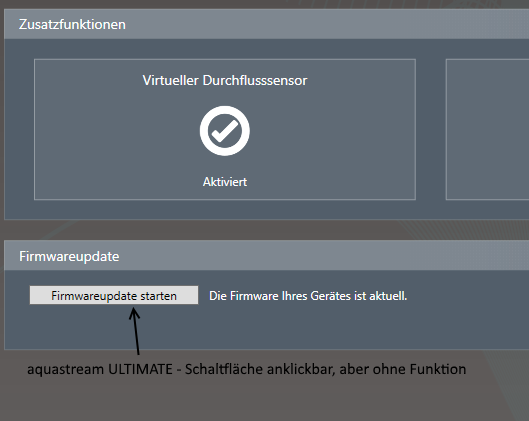 Bei der aquastream ULTIMATE hingegen kann man, auch wenn die Firmware aktuell ist, auf die Schaltfläche "Firmwareupdate starten" klicken - es passiert aber natürlich nichts weiter. Hier sollte die Schaltfläche wie beim mps ausgegraut sein, wenn die Firmware aktuell ist.