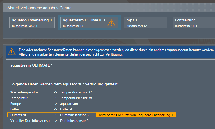 Beim aquaero werden die aquabus-Geräte mit der neuen aquasuite-Version auf Ressourcen-Konflikte überprüft und mit einem Warnsymbol und Hinweisen zu den Überschneidungen markiert. Dies hilft den Überblick bei komplexen Systemen zu bewahren und zu erkennen woher ein angezeigter Sensor kommt.
