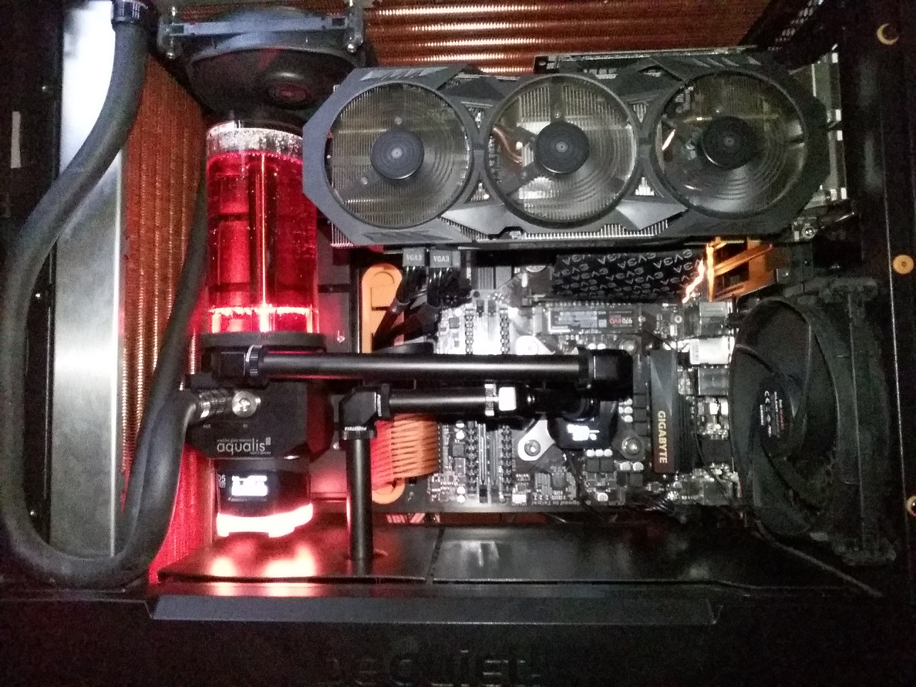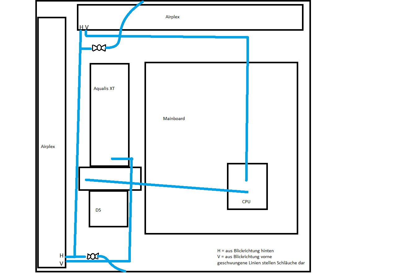 Von der Leitungsführung passt das soweit, sofern die Flussrichtung "AGB --> CPU-Kühler --> oberer Radi --> seitlicher Radi --> AGB" ist. Damit hättest du das Gegenstromprinzip und damit die größtmögliche Effizienz.