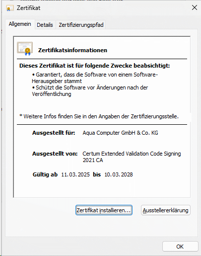 Was die neueren Versionen der Aquasuite angeht, erkennt Kaspersky völlig zu Recht einen false positiv. Dies liegt aber nicht an Kaspersky oder einer dubiosen Warnung des BSI, sondern am Hersteller der Aquasuite @shoggy. Denn das digitale Zertifikat der .exe wird zwar als im Prinzip gültig anerkannt, es wird aber von keiner anderen Stelle bestätigt.