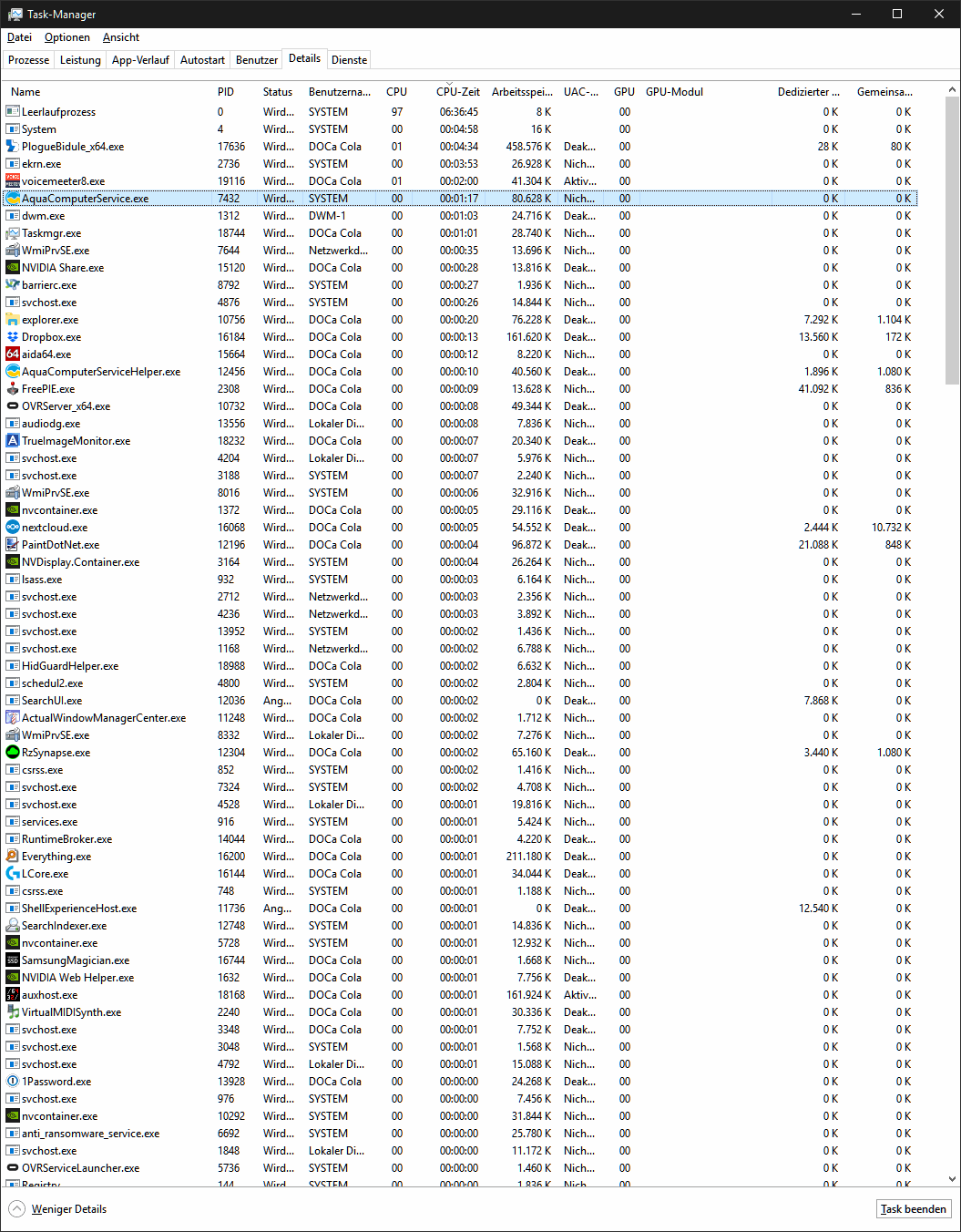 Screenshot im Anhang: Mein Task-Manager ca. 20 Minuten nach dem booten sortiert nach CPU-Zeit. Von allem Hintergrunddiensten führt AquaComputerService die Liste klar an. Dazu kommt auch noch etwas weiter unten der AquaComputerSericeHelper. Razer, Logitech, Nvidia, vpn, realtek, classic startmenu, vnc, dropbox, nextcloud und ein dutzend andere Hintergrunddienste habe ich auch am laufen.