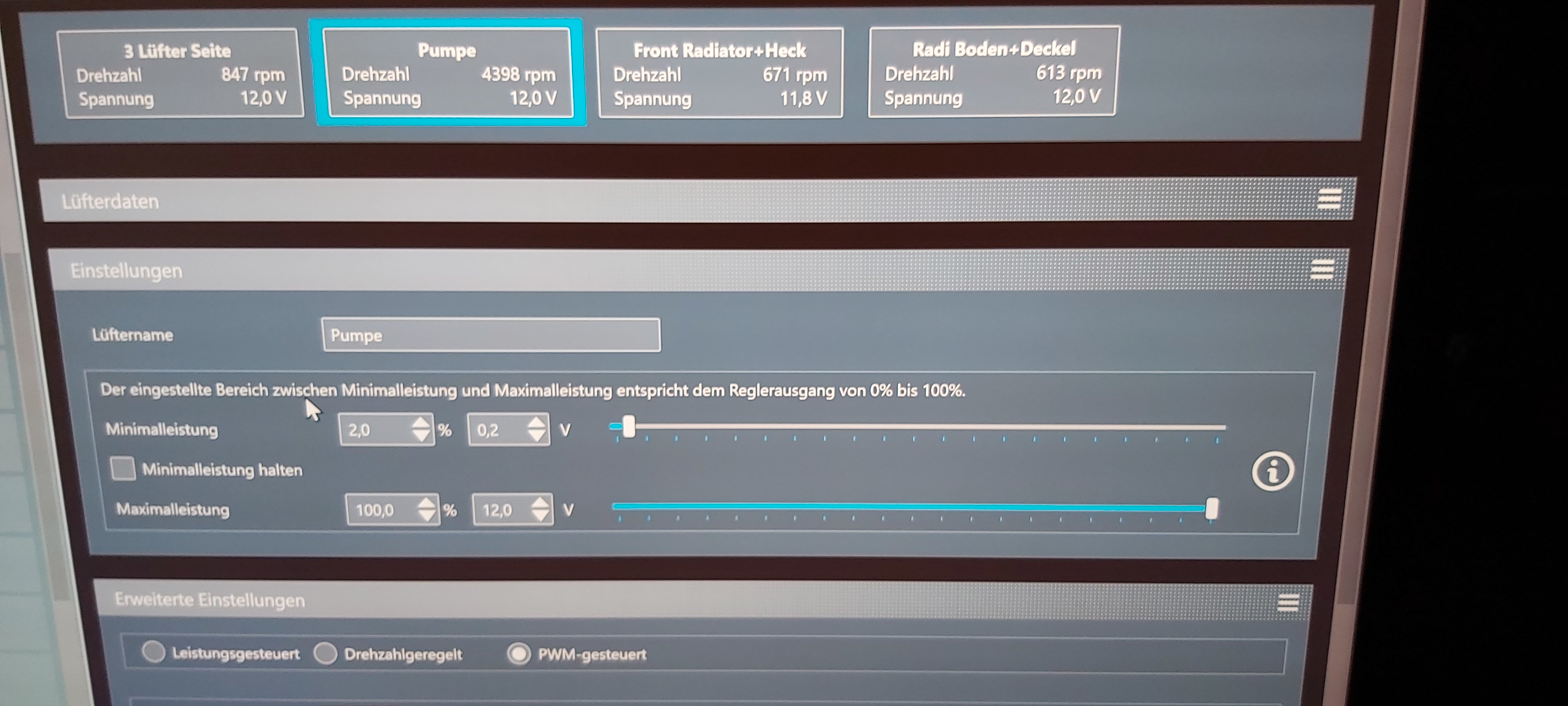 Ok aber ich denke die Steuerung ist wirklich defekt habe die Pumpe unter Lüfter auf pwm gestellt den minimal Wert auf 2% und den maximal Wert auf 100%
