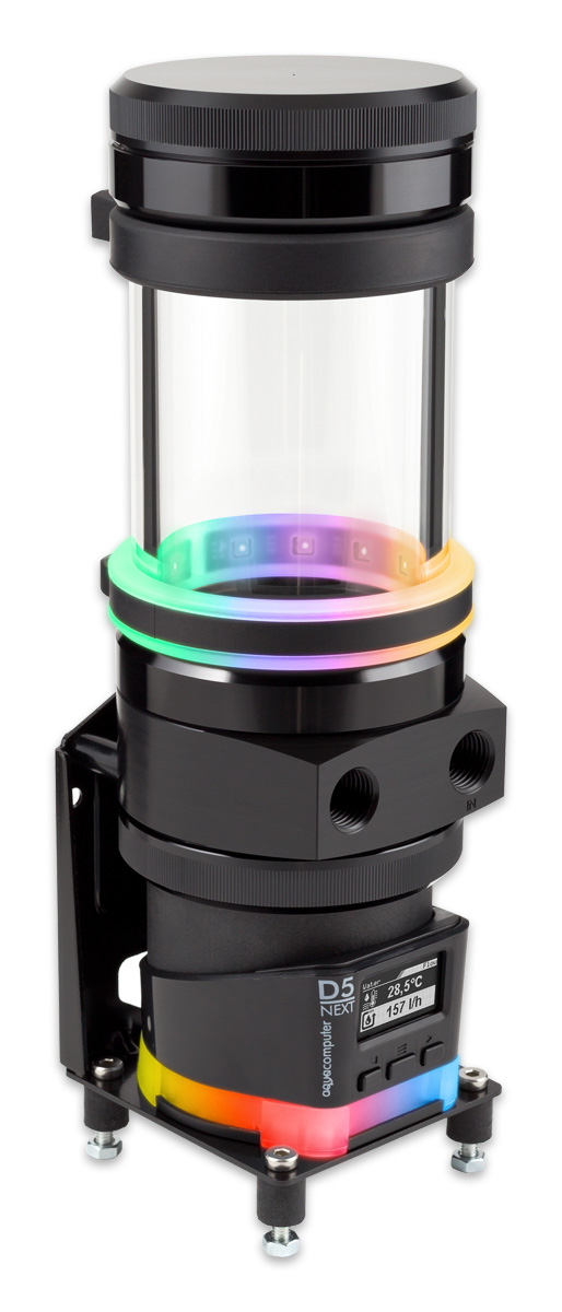 Der ULTITUBE D5 wird ab Werk auch optional direkt montiert mit D5 NEXT oder D5 PWM Pumpe angeboten. Dabei wird bei der Variante mit D5 NEXT die PRO Version angeboten.