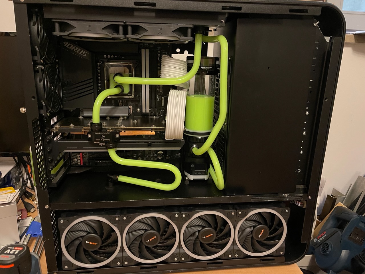 Gehäuse kippen ja, abder die Membran vom Leakshield sollte nicht mit Wasser in Kontakt kommen! Ich würde folgendes probieren, Pumpenleistung auf 100% und zur Unterstützung Gehäuse leicht kippen, so dass du die Luft aus dem CPU Kühler bekommst. Pumpe wieder zurück drehen, ein paar Minuten beruhigen lassen (damit sich die Mikroblasen etwas auflösen), dann Vorgang wiederholen, bis die Luft komplett raus ist. Beachte bitte, dass du die Luft durch den GPU Kühler und die nachfokgenden Radiatoren bis in den AG transportieren musst. D.h Gehäuse nach allen Seiten mal kippen und dabei Pumpe auf 100%.