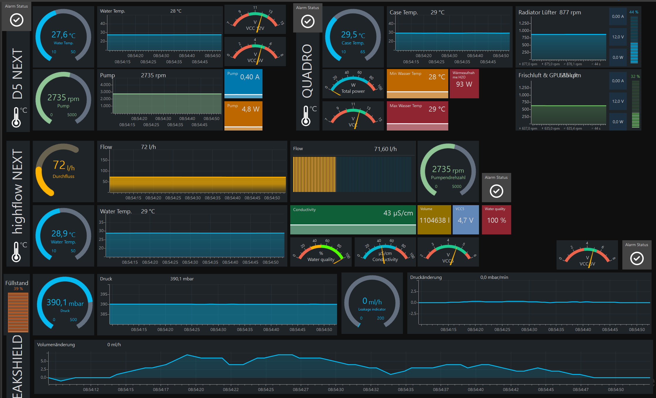 Beim täglichen Einsatz des Rechners kann ich morgens kein Gluckern hören die auf Luft im Kreislauf schließen lassen. Ebenso kleine Luftblasen sind nicht zu erkennen - wenn am Vortag nicht die Temperaturen im Rechner hoch waren. Falls dies der Fall sein sollte, habe ich an der höchsten Stelle einige winzig kleine Blässchen in den Rohren schweben. Sobald der Kreislauf in Bewegung kommt, ist davon nichts mehr zu sehen. Ebenso mit dem nervigen Nachpumpen kann ich nichts zu sagen. Ich habe bei mir gleich von Anfang an den Unterdruck zwischen 380mbar und 400mbar eingestellt. Wenn es im Gehäuse warm wird (oder alleine schon im Zimmer), geht der Unterdruck von alleine runter. Vollkommen normal :thumbup: dadurch das der Unterdruck gleich von Anfang an was höher ist, komme ich auch unter Last nicht in Bereich wo das Leakshield nachpumpen müsste.