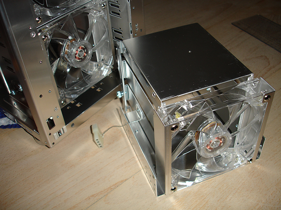 Schade ist natürlich, dass der Front-Einbau warme Luft zur Folge hat, die ins Gehäuseinnere geblasen wird. Ein zusätzliches Loch oben reinzusägen kommt für mich eigentlich nicht noch mal in Frage. Dafür bietet der Tower mehr als genug Platz, um Komponenten anders zu verteilen.