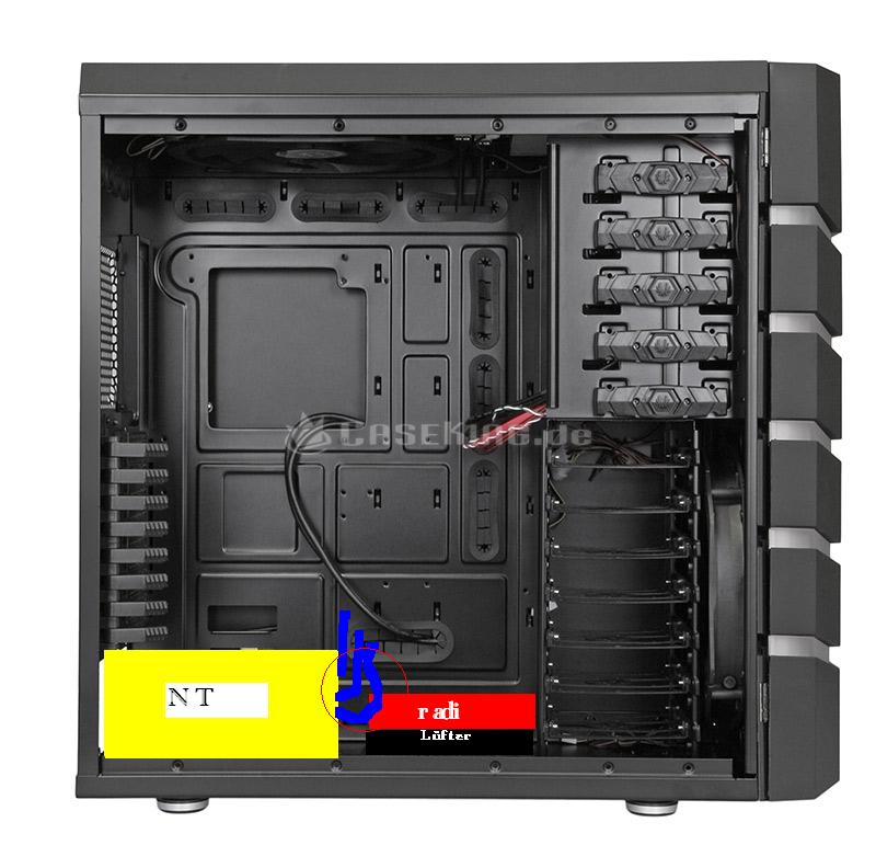 . vlt ein 140 im Boden, einfach auf den optionalen lüfter draufschrauben. Sieht vlt net gut aus und du könntest probleme mit dem Kabelverlegen bekommen