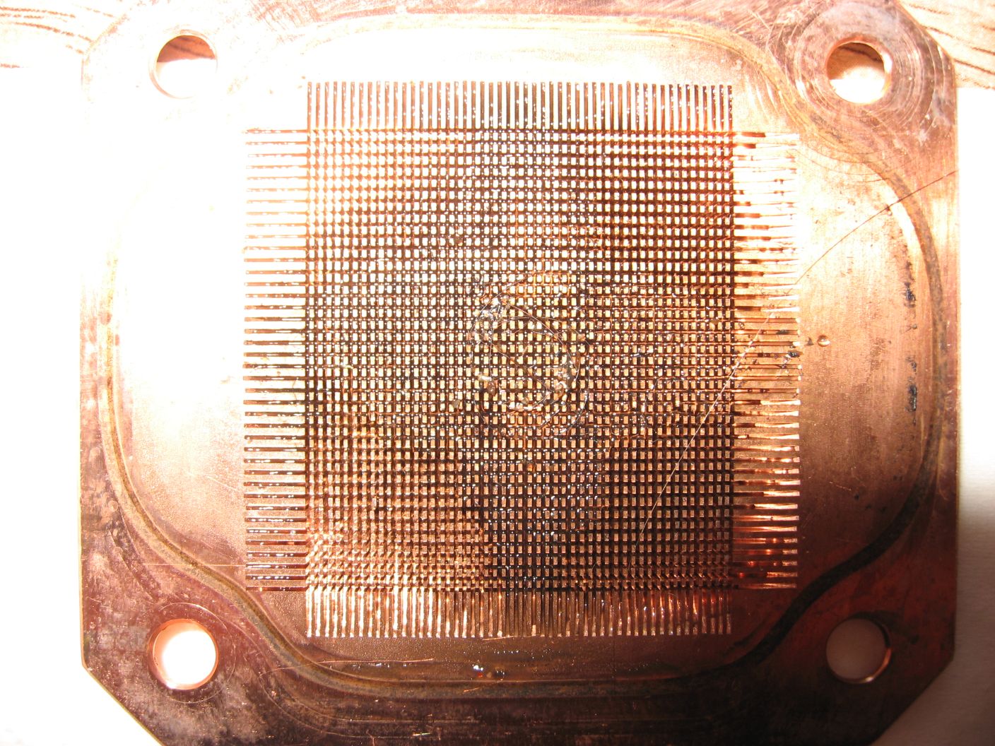 Ich hab die Kühlrillen des Kryos mit einem mittelgroßen Schweineborsten-Pinsel gesäubert, was recht gut ging, aber trotzdem zu einigen verbogenen Pins führte, die ich dann mühsam mit einer sehr feinen Nadel unter einer Lupe wieder aufrichten musste. Aber im Großen und ganzen war der Kühler nicht einmal sonderlich verdreckt, da die Pins und Rillen so fein sind, dass nur sehr sehr kleine Flussmittel-Bröckchen stecken blieben und die konnte ich auch schon ganz einfach mit Wasser ausspülen, ohne den Pinsel bemüht haben zu müssen. Die unteren angehängten Bilder zeigen den Kühler kurz nach dem Abbauen der Anschlüsse, das vermeintliche Flussmittel und die noch nicht gereinige Rillenplatte nach dem Abnehmen des Deckels und dem Aus-/Abklopfen des Flussmittels. Ich hatte den Pinsel noch nicht verwendet. Drei Jahre Dauerbetrieb, ~3 Liter Kühlwasser, davon 1 Liter Double Protect Ultra. Wenn das nicht für sich spricht, dann weiss ich auch nicht. Wie die Leute immer ihre CPU-Kühler so zugekleistert bekommen, ist mir deshalb ein Rätsel. Vielleicht liegt's auch daran, dass ich mein System vor der ersten Inbetriebnahme nicht mit Leitungs- sondern 'destilliertem' Wasser gespült hatte. Also keine Algen, oder Bakterien oder sonstwas Lebendes, dass im warmen Kühlwasser die Chance bekam sich ungestört zu vermehren. Ich weiss es nicht.