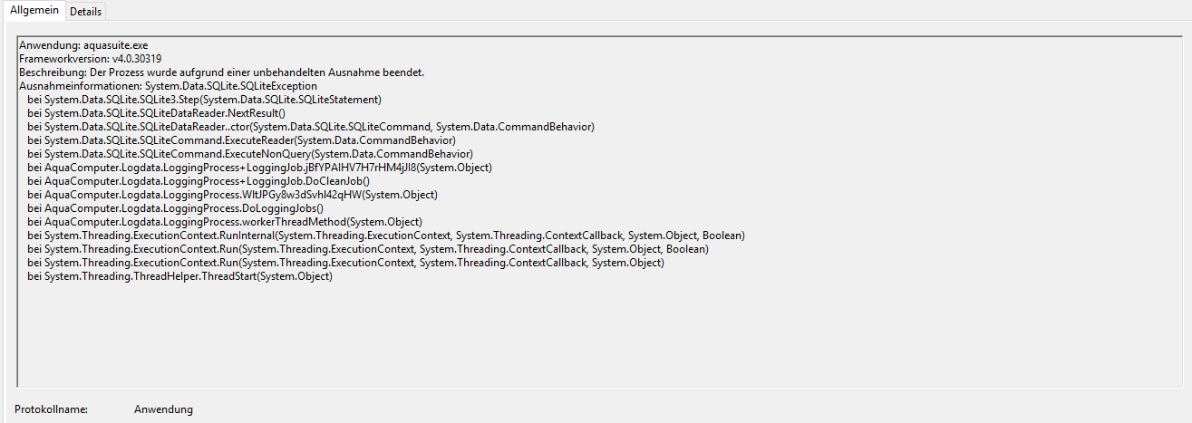 Nach einem Systemneustart und Autostart der aquasuite wollte ich diese öffnen, aber sie ist beim Laden der Übersichtsseite eingefroren und abgestürzt. Fehler aus der Ereignisanzeige im Anhang.