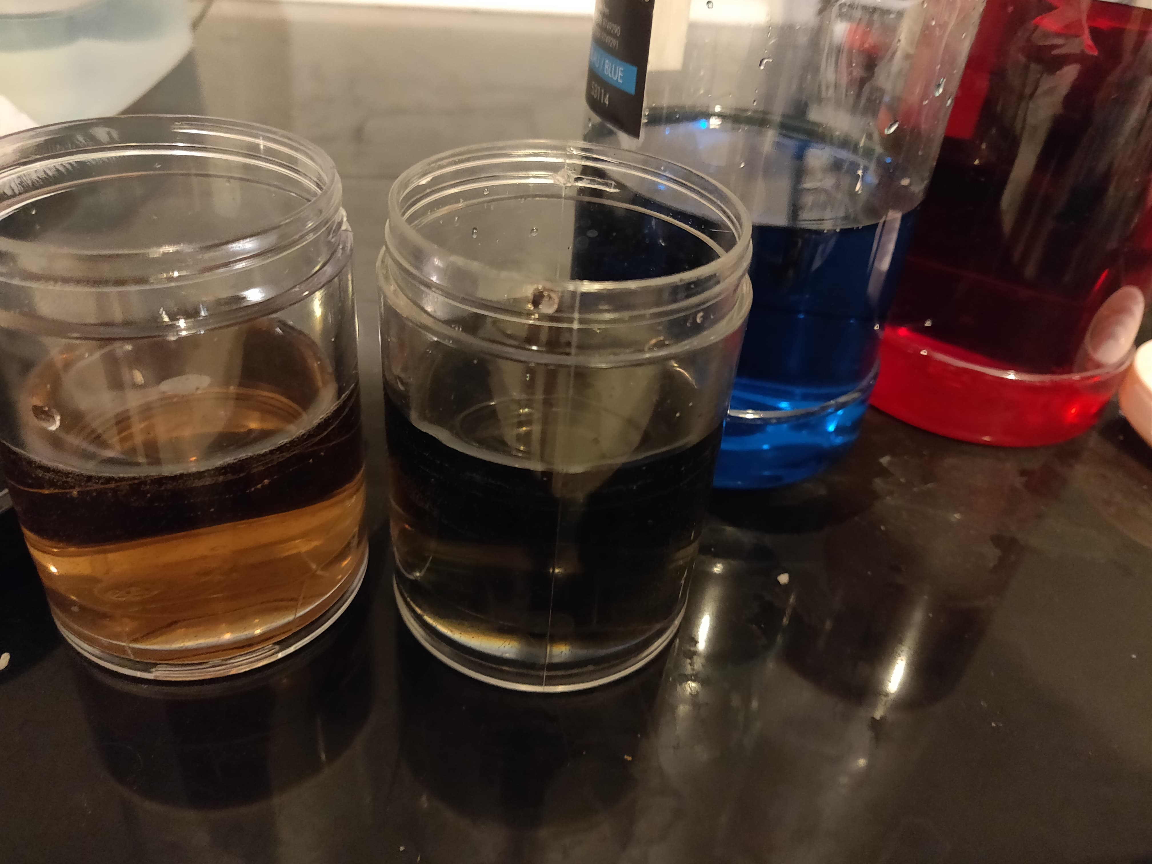 Dann dachte ich das ich es nun etwas in richtung Lila ziehe also etwas pepp rein bringe mit DP Ultra Blau. Habe also bisschen Blau zugemcaht und keine Reaktion. Optisch gleich. Ok noch bisschen Blau zu. Nix. Ok noch bisschen blau zu zack kackbraun orange rot undefinierbare optik :D Bernsteinfarben oder so. Reagiert es vielleicht irgendwo anders das ich vielleicht ein anderes DP noch zumischen muß grün, gelb orange ich weiß nicht? Habe nur Klar, Rot, Blau hier.