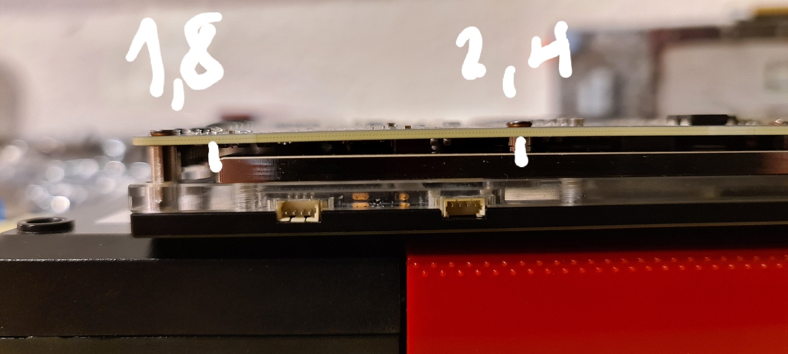 P.S.: Ich habe jetzt erstmal, um meine Karte nicht zu verbiegen, 0,8mm Kunststoff-Unterlegscheiben zwischen die Platine und die Gewindestangen gelegt.Zieht man damit die Schrauben an, ist die Platine jetzt schnurgerade.
