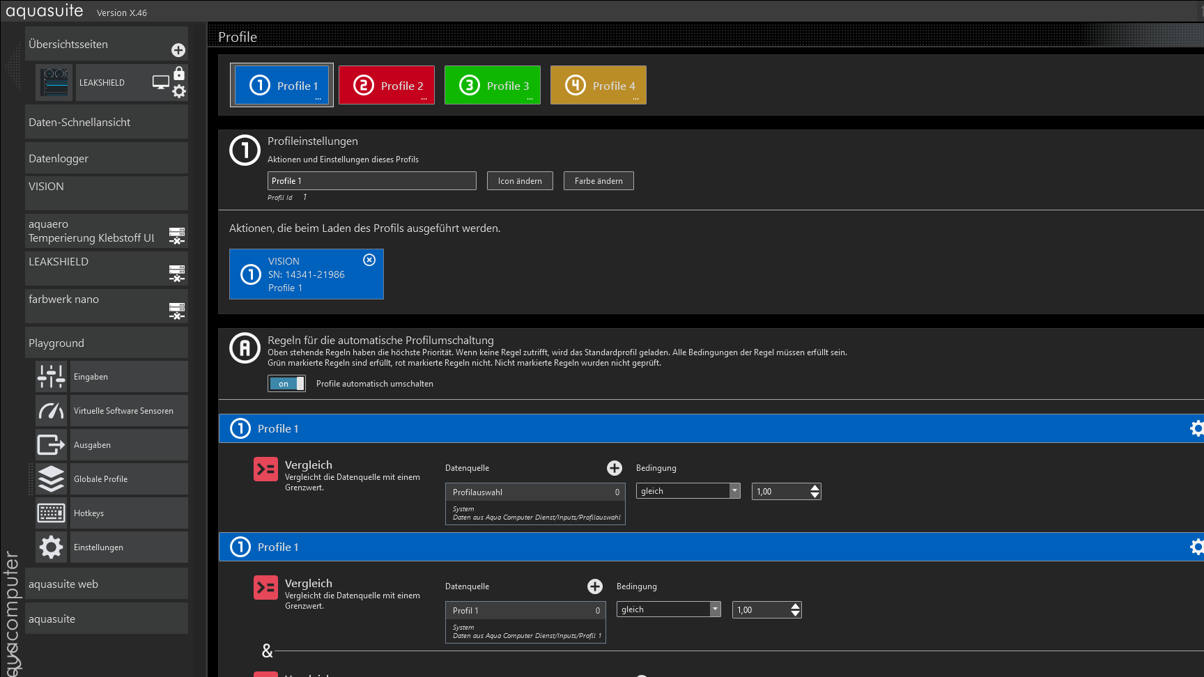 Natürlich kann man den virtuellen Sensor Profilauswahl dann für mehere Profile verwenden und entsprechend vergleichen. Die Regeln in den Globalen Profilen sind für einfache Fälle gedacht, alles komplexe kann im Playground erledigt werden.