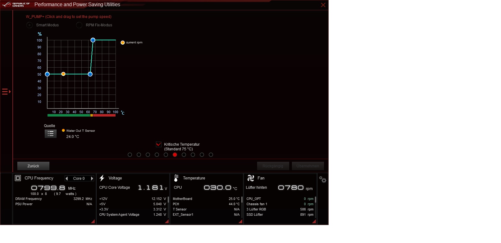 Lüfterheader am Board, sie hängt an den dafür vorgesehenden Pumpen Anschluss, wie das geregelt wird, kein Plan. In der Software von Asus stelle ich sie auf 50%. HWInfo zeigt mir keine Pumpendrehzahl an, ich stelle die Pumpe von 50% auf 100% und ich sehe nirgendwo eine veränderung. Vielleicht kann man in den option von HWInfo die Pumpen Leistung erst hinzufügen damit sie angezeigt wird? Ich gucke gleich mal nach.