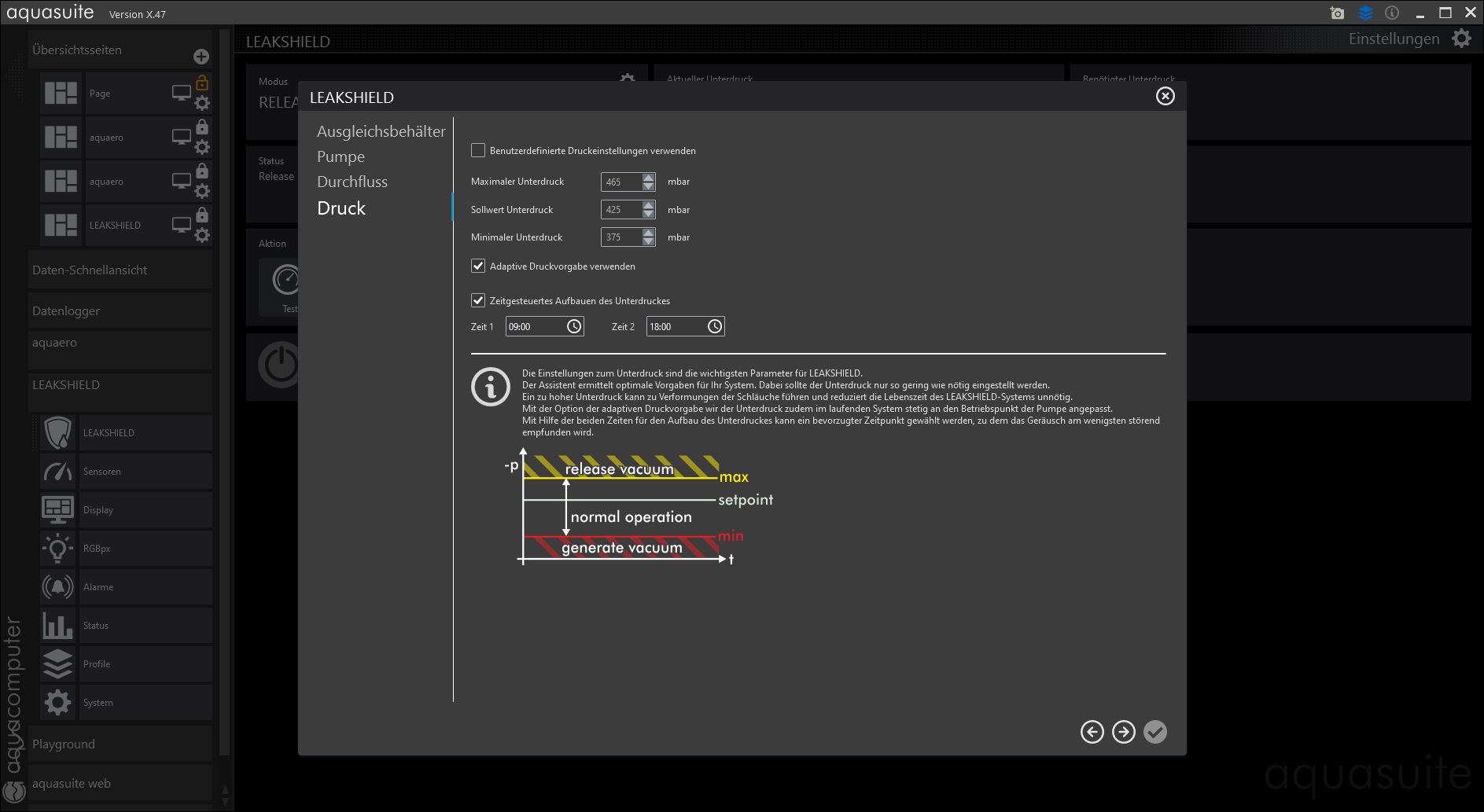 Nach der Konfiguration von LEAKSHIELD, versucht LEAKSHIELD die angegebenen 375mbar zu erreichen, da meine Pumpe nur auf 50% läuft da sie mir sonst zu laut ist, erreiche ich die 375mbar nicht. Wenn ich die Pumpe jetzt auf 100% stellen würde, dann könnte es gut sein das ich die vorgeschriebenen 375mbar erreiche, aber wenn ich danach die Pumpe wieder auf 50% stelle und LEAKSHIELD später den Druck nachregeln möchte, dann würde ich logischerweise die 375mbar wieder nicht erreichen. LEAKSHIELD versucht die 375mbar zu erreichen, schafft es mit einer Pumpenleistung von 50% nicht die 375mbar zu erreichen, kommt nur bis maximal 359mbar, hört dann irgendwann auf zu versuchen die 375mbar zu erreichen, lässt den Druck komplett wieder ab und versucht es 30sek später wieder, das wiederholt sich dann immer wieder, da er die 375mbar nicht erreicht mit einer eingestellten Pumpenleistung von 50%.