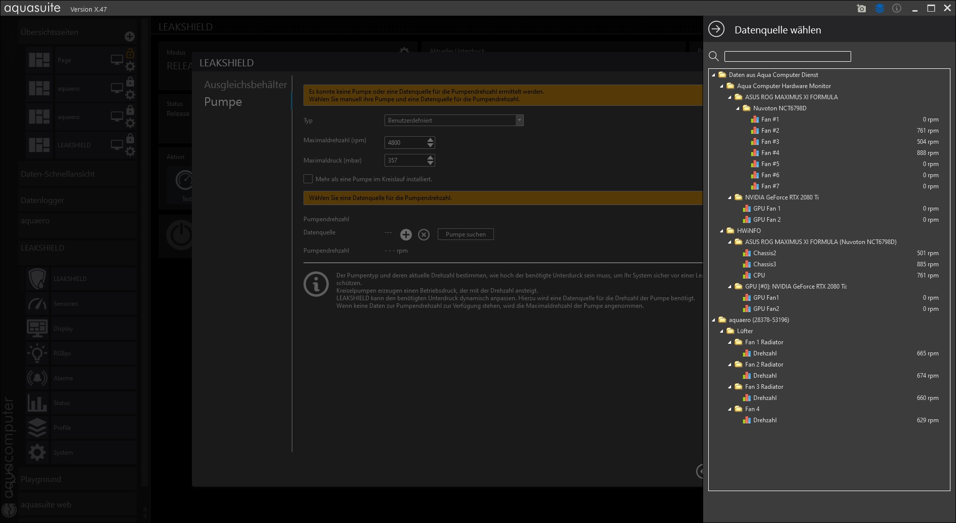 Zuerst würde ich mal die Pumpe auf D5 stellen und die Pumpendrehzahl als Eingabe für den LEAKSHIELD konfigurieren, wenn die Aquasuite den Wert nicht von Deinem Motherboard auslesen kann könnte HWInfo (kostenlos ist die letzte 6.xx Version) als Datenquelle helfen.