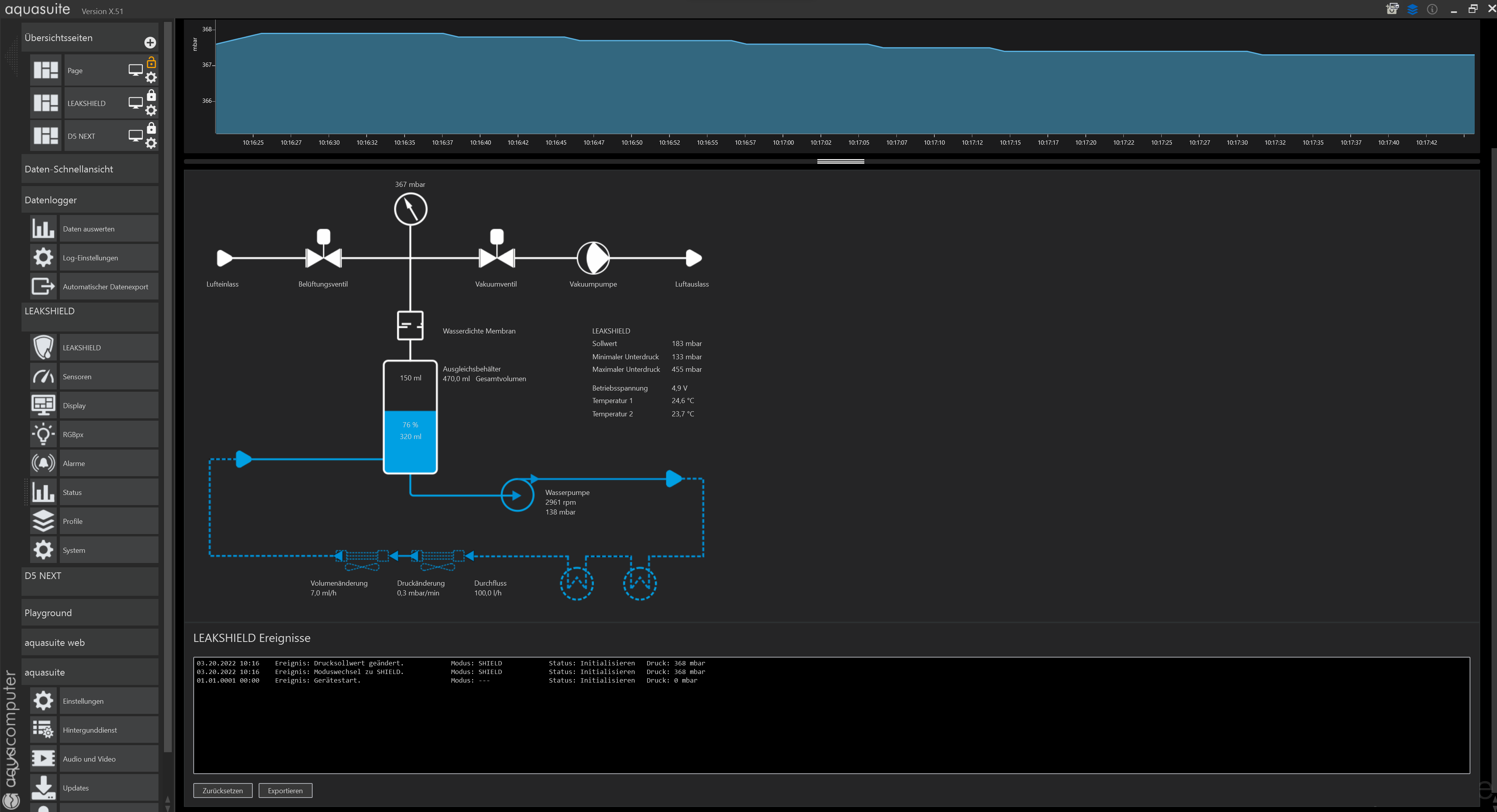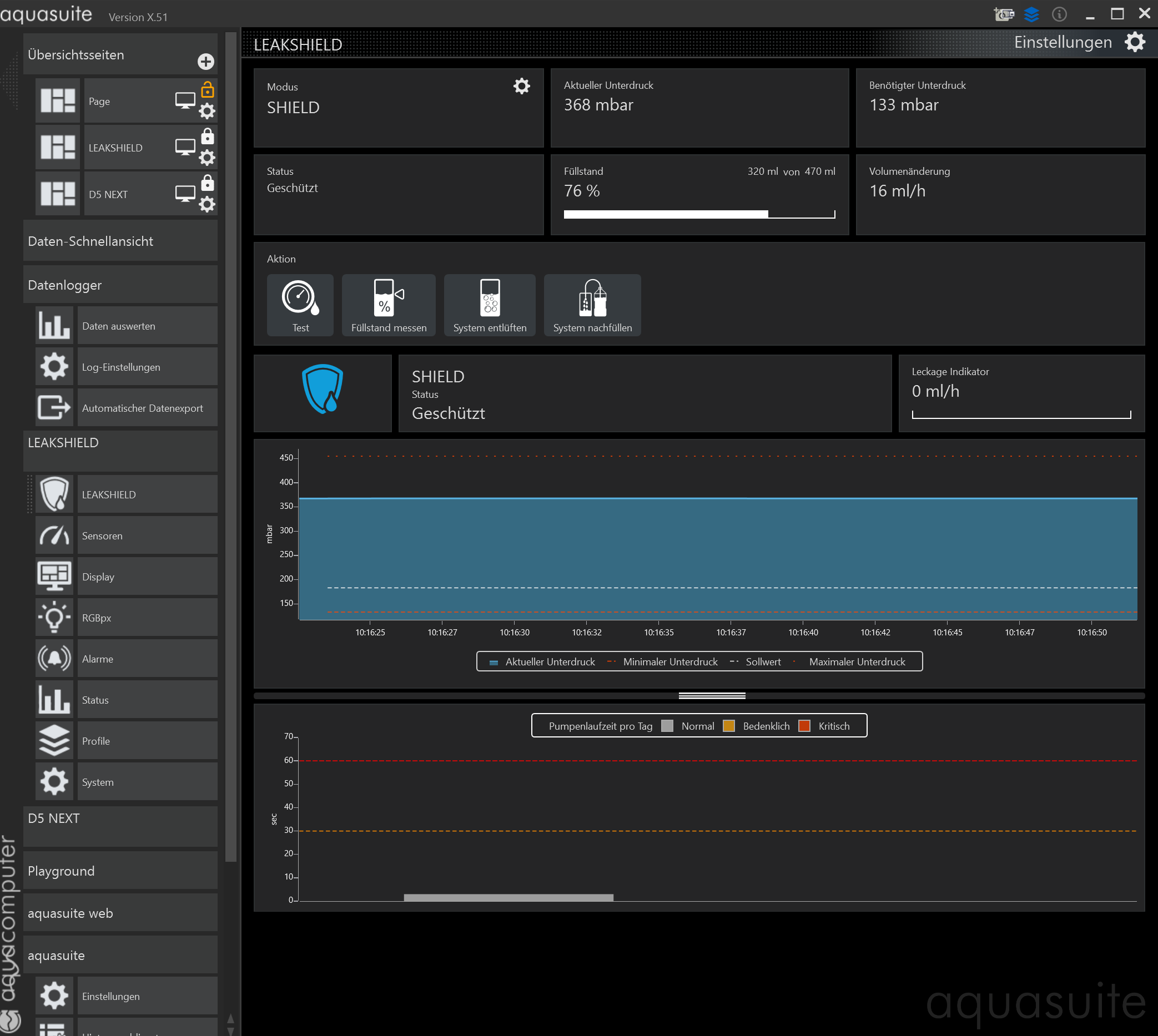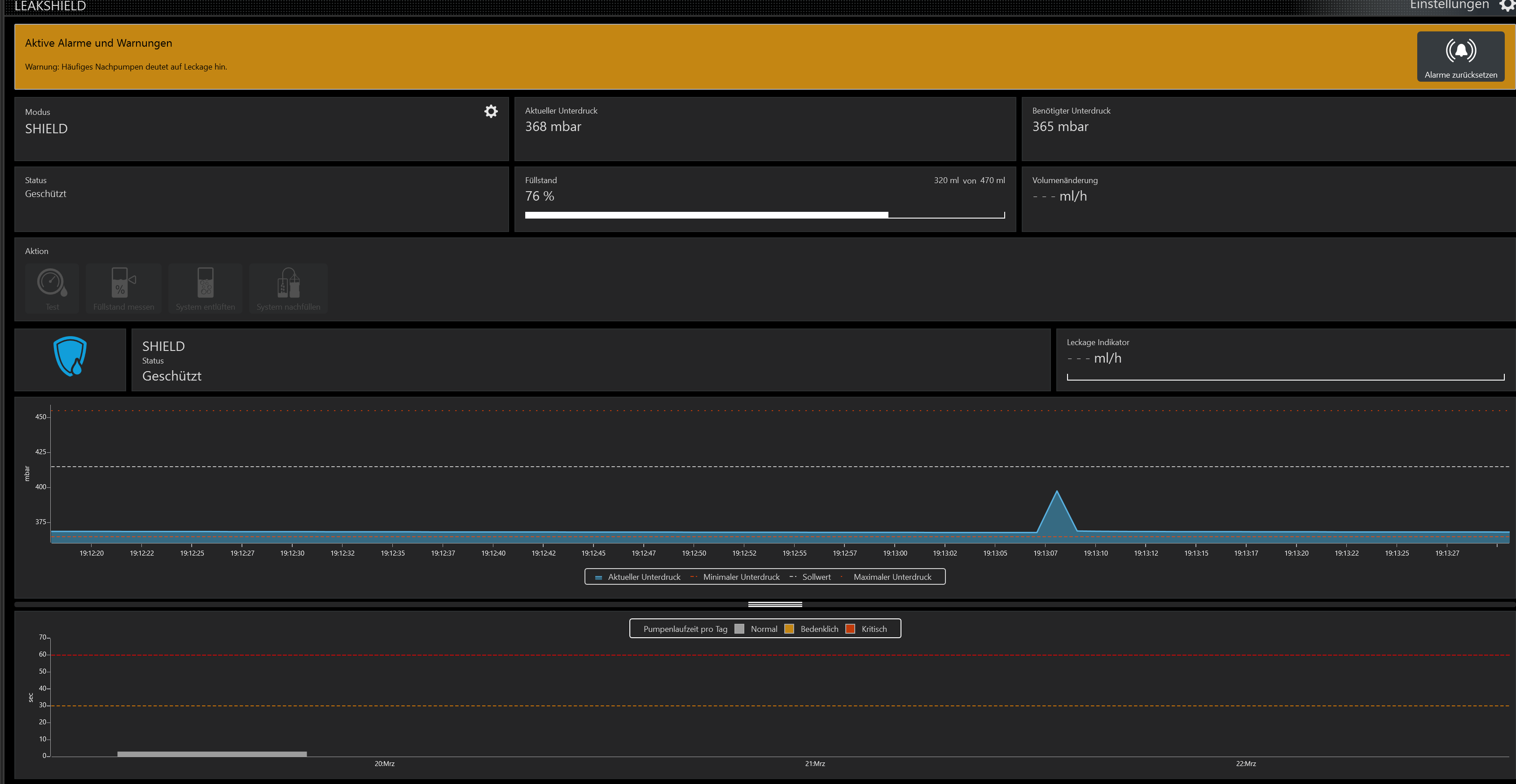In diesem Fall sehen wir 40 Sekunden Druckhistorie und 25 Sekunden der LEAKSHIELD Seite.