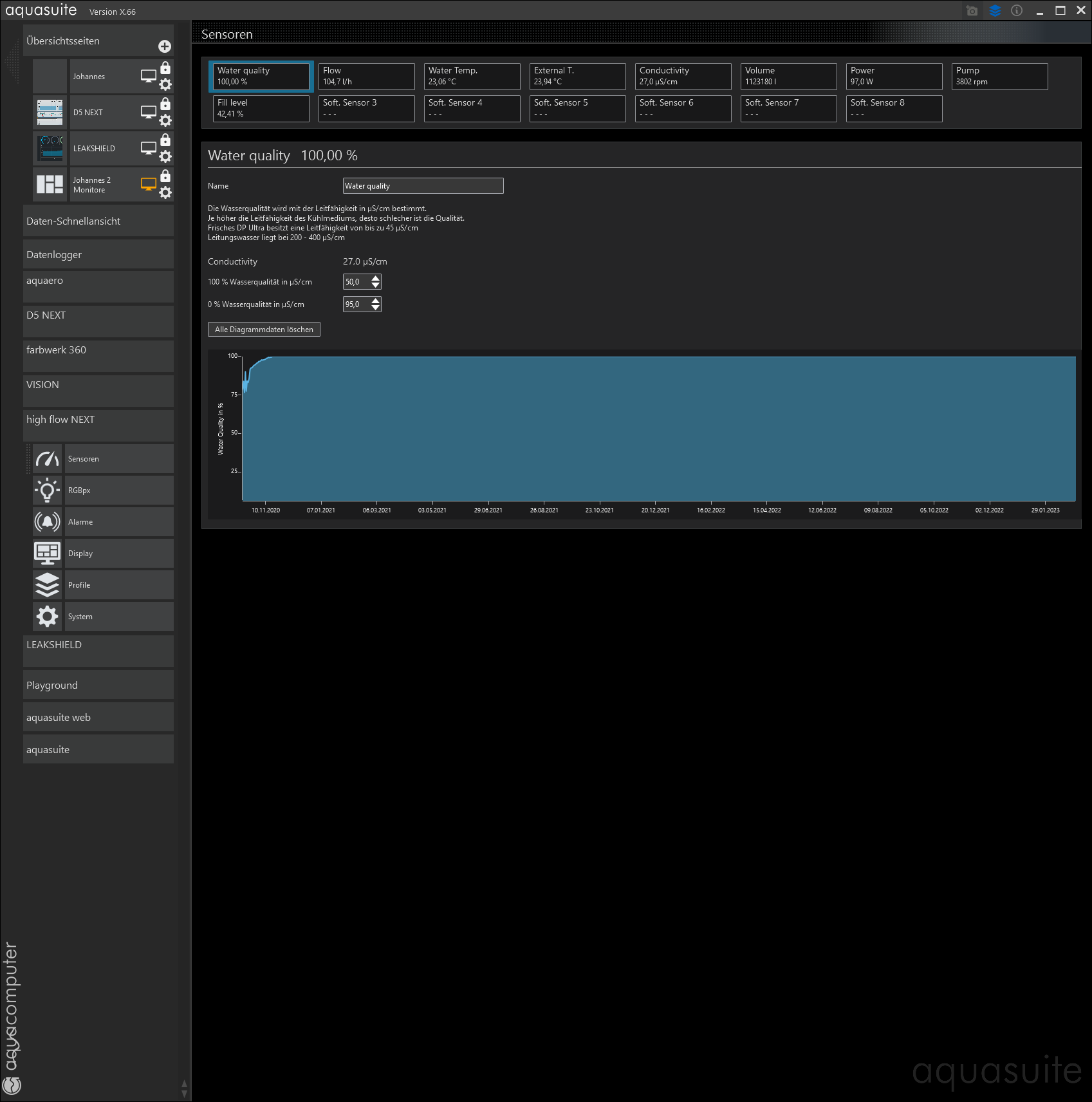 Anbei mal das Diagramm mit der Wasserqualität seit Einbau des highflow NEXT, das Wasser war zu dem Zeitpunkt ebenfalls das alte DP Ultra mit ein wenig zusätzlich, weil ich einen weiteren Radiator verbaut habe.