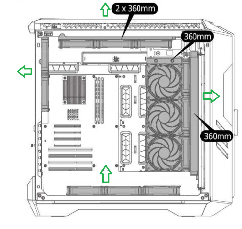 Die Radiatorenpositionen wären 2 x oben, 1 x seitlich, 1 x vorne. Alle Lüfter die an den Radiatoren hängen blasen hinaus (15 Stück). 2 separate blasen hinten raus und von unten saugen 3 frische Luft hinein - passt das so?