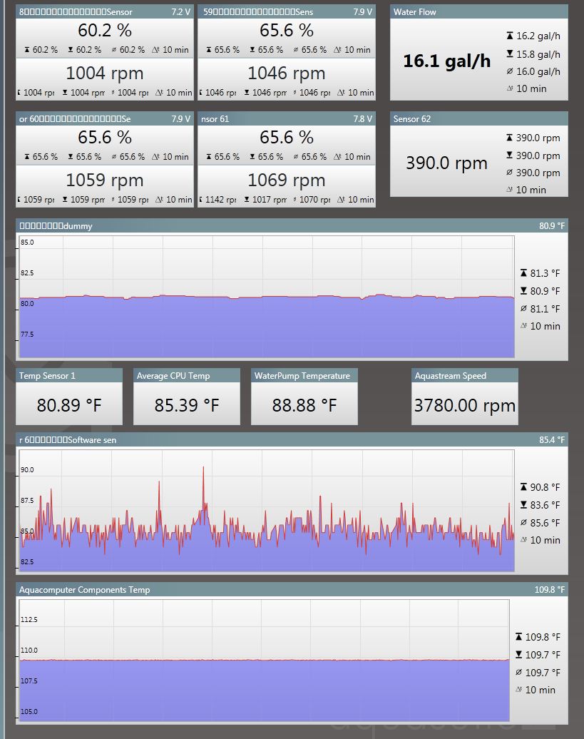 Im using Flow sensor, one physical temp sensor on the Aquaero, 3 software temp sensors (provided by Open Hardware Monitor) and 1 virtual (average from the three Software Temp sensors).
