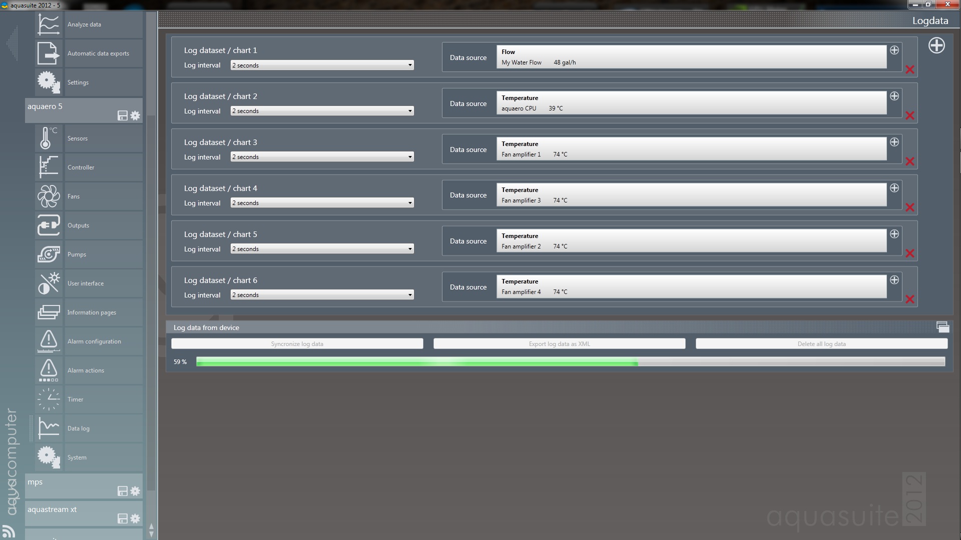 it will lock up at 59%,i just updateded my fw on the aquaero 5 and on my mps. when u get done with what u want to put into the log data do u have to syncronize your log data.here is a picture of what i see.....is syncronizing your log data mean syncronize with your aquaero right..lol.. if i am doing something wrong please tell me.thanks all .do u guys have any documents on the aquasuite 2012 yet , there is alot of stuff in the aquasuite 2012 that i dont know what it does or what its for..lol i never got use to the beta version..lol thanks again