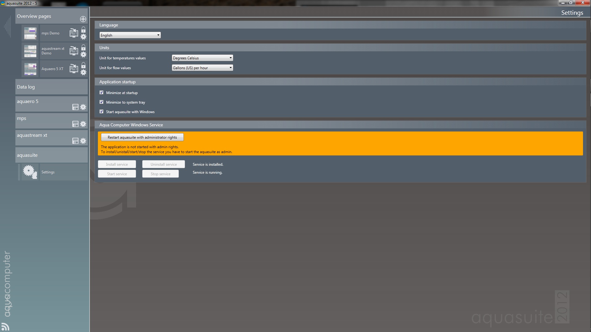 no,when i start my computer then everthing loads,then i will click aquasuite 2012 down in the taskbar end when it comes up i will click where on the bottem says aquasuite then under that will say setting ,then u know the page come up and under that where it will say aqua computer windows service,under this it will say restart aquasuite with administrator right here is a pic.i am just wondering if there is a way that i dont have to keep restarting it and it will load with the admin right when i first turn on my computer and it all loads. i know this might not be the site for this but does anyone know of a very good soundcard.ohh thanks again