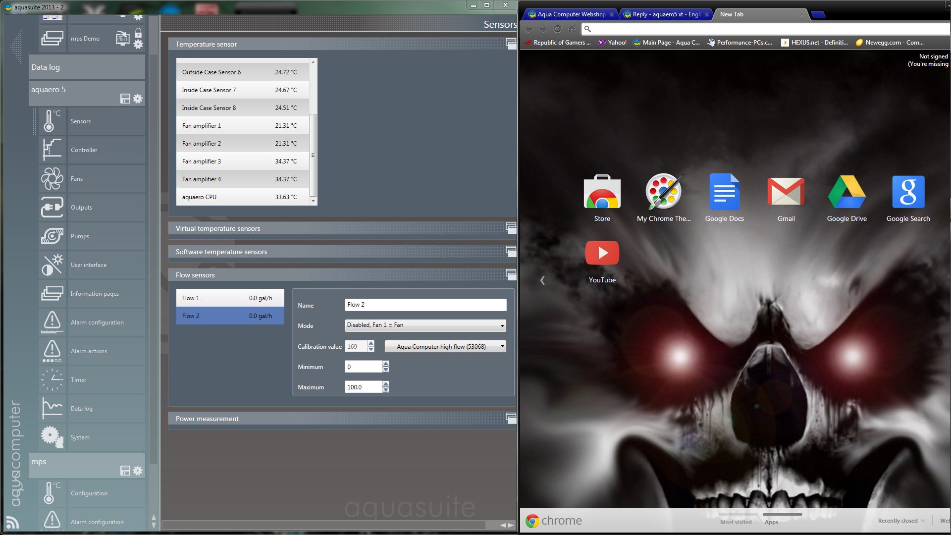 I've been attempting to setup my High Flow Meter USB with no success. I have it hooked up by USB at the moment but I cannot seem to get it to show up under the "sensors" tab under aquaero.The flow rate and internal temperature sensor seem to be working in the alarm configuration tab.I have tried everything hooked new aqua wires to it,plugged in both usb and hooed to aqua high flow the only time i get a reading is when i click in the aqua software on the aquaero 5 is sensors then click flow and then click the second flow and click on mode and click active, fan 1=flow sensor 2 then i see flow , when i click mps i see in the alarm tap that there is flow says 47.8 gal/h i hope someone understands what i am trying to say thanks all