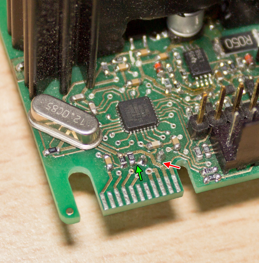 The green arrow shows what I mean but in this case it is OK because this resistor and the left pin of LED are connected anyway through a circuit path. But if you see something similar to that in the area which is marked with the red arrow it will be wrong. If the soldering point there has contact to the circuit path you have to cut this connection. It should be enough to point a soldering iron to the soldering point to make it move away.