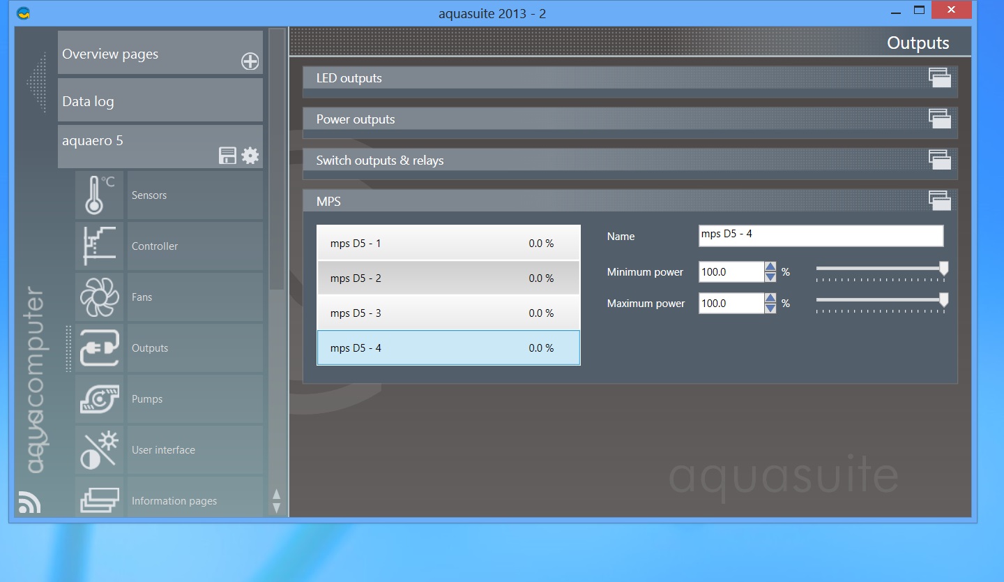 3) For the pump to show up in the Aquasuite through the Aquaero 5 (if you have it connected via the Aquabus) Tab it will be in the Aquaero 5 Menu Tab in the "OUTPUTS" menu.
