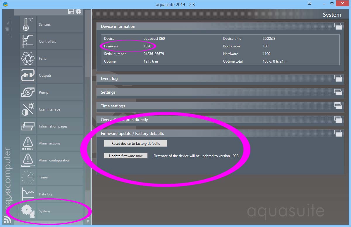 If you click on the system tab under the aquaero, you will see your current firmware version, and the version it is able to update to.