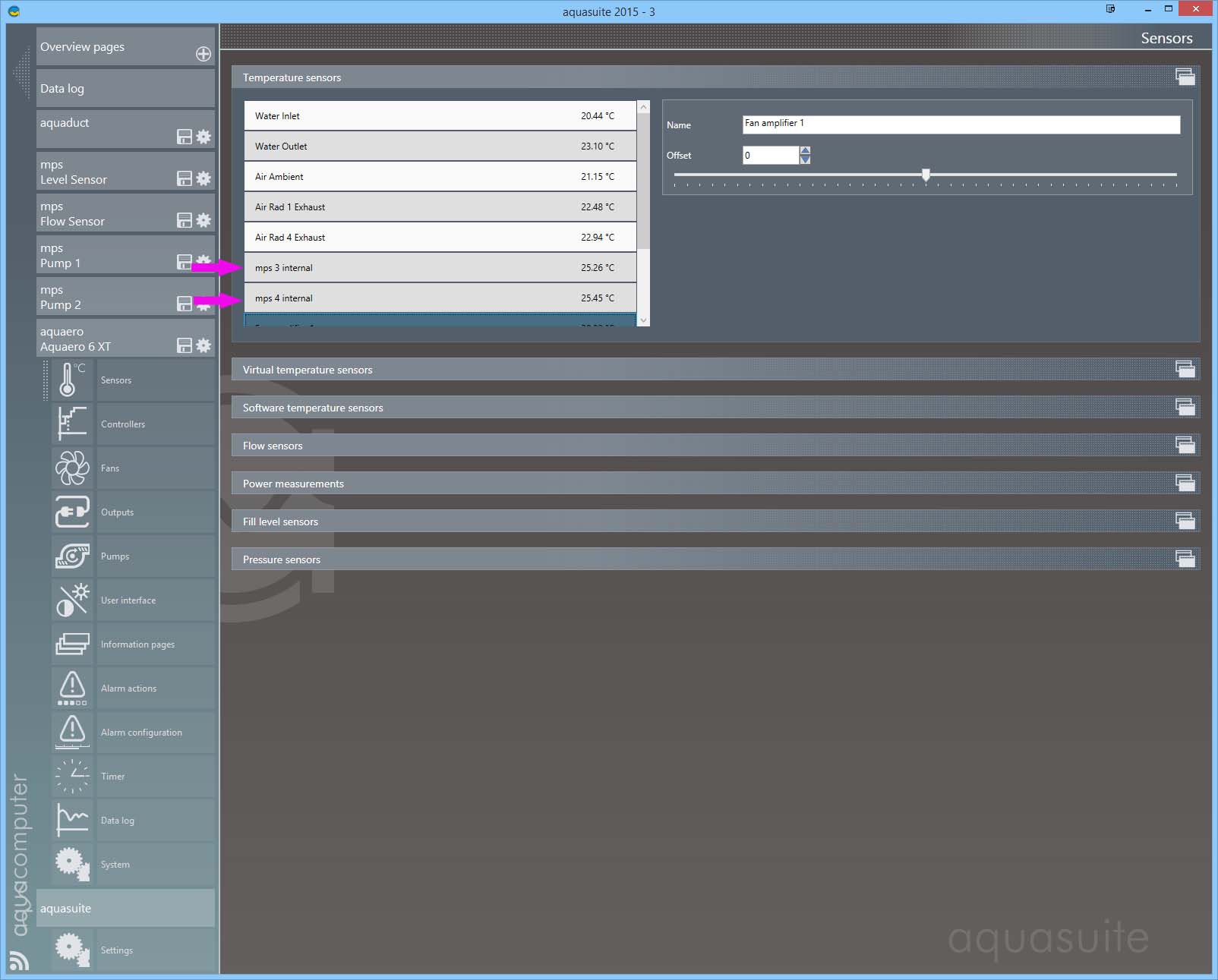 The screen-shot below lists the five temperature sensors I added to the aquaero 6 XT which are followed in the list by 'mps 3 internal' & "mps 4 internal' temperature sensors.