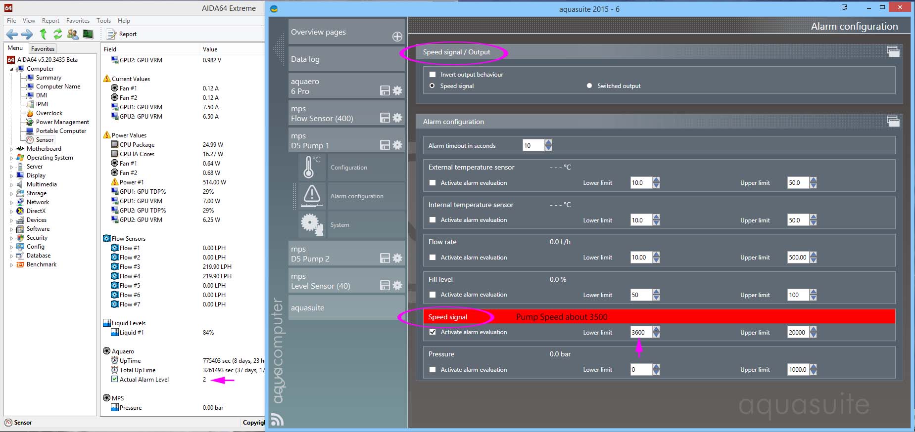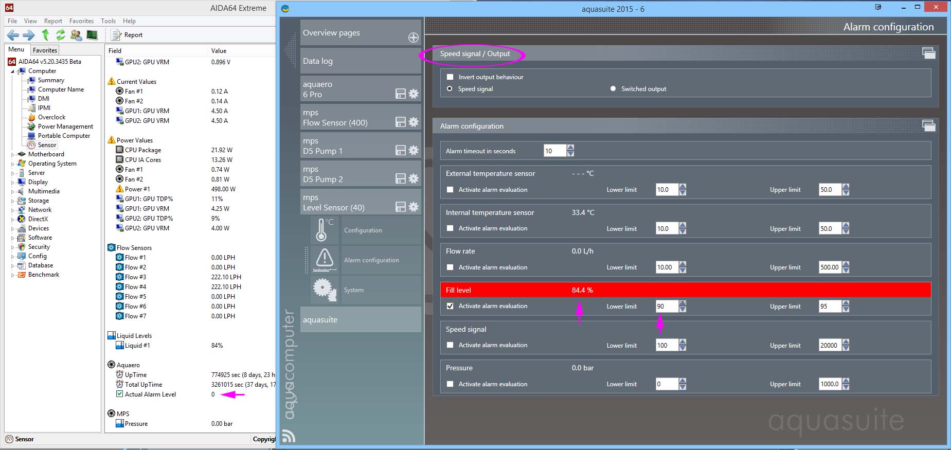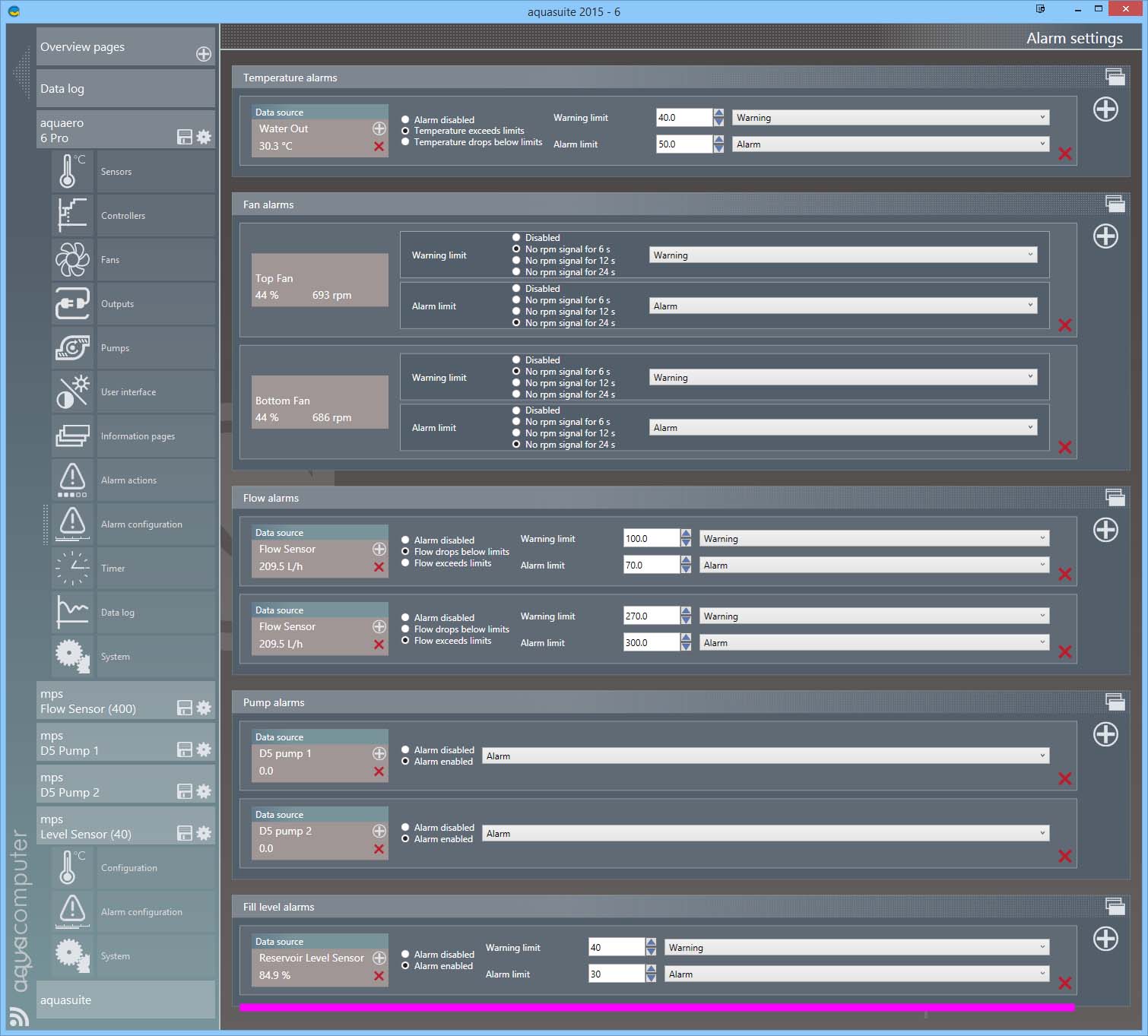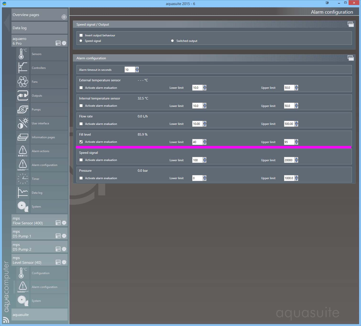 For the MPS D5 Pumps, forcing an alarm situation caused a red bar to come up on the device alarm page, AND Actual Alarm Level was set to 2, with the aquaero reacting by executing the alarm level 2 setting (red LED & cyclic buzzer)
