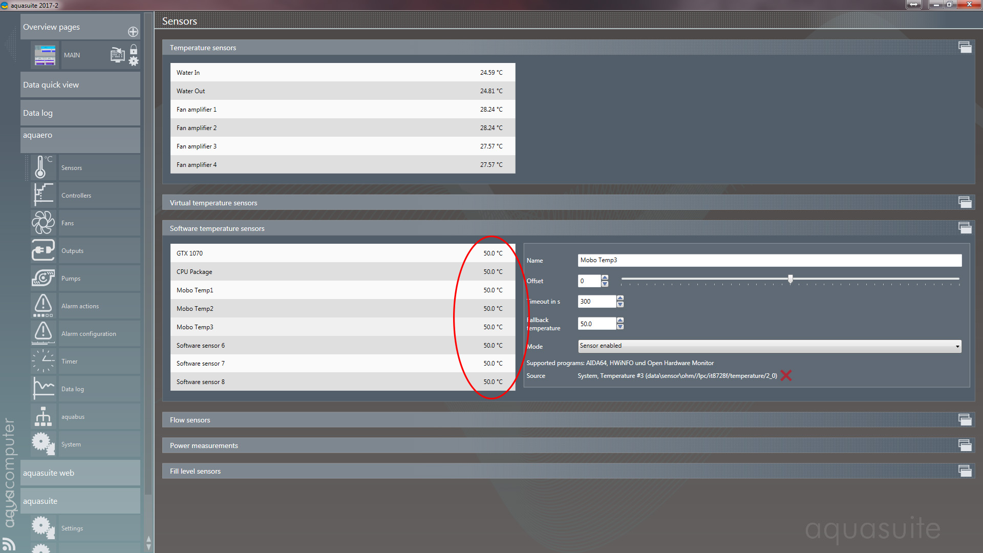 heading into the sensors section of Aquasuite shows that all the software sensors are displaying 50 degrees even though the main screen shows them to be working.