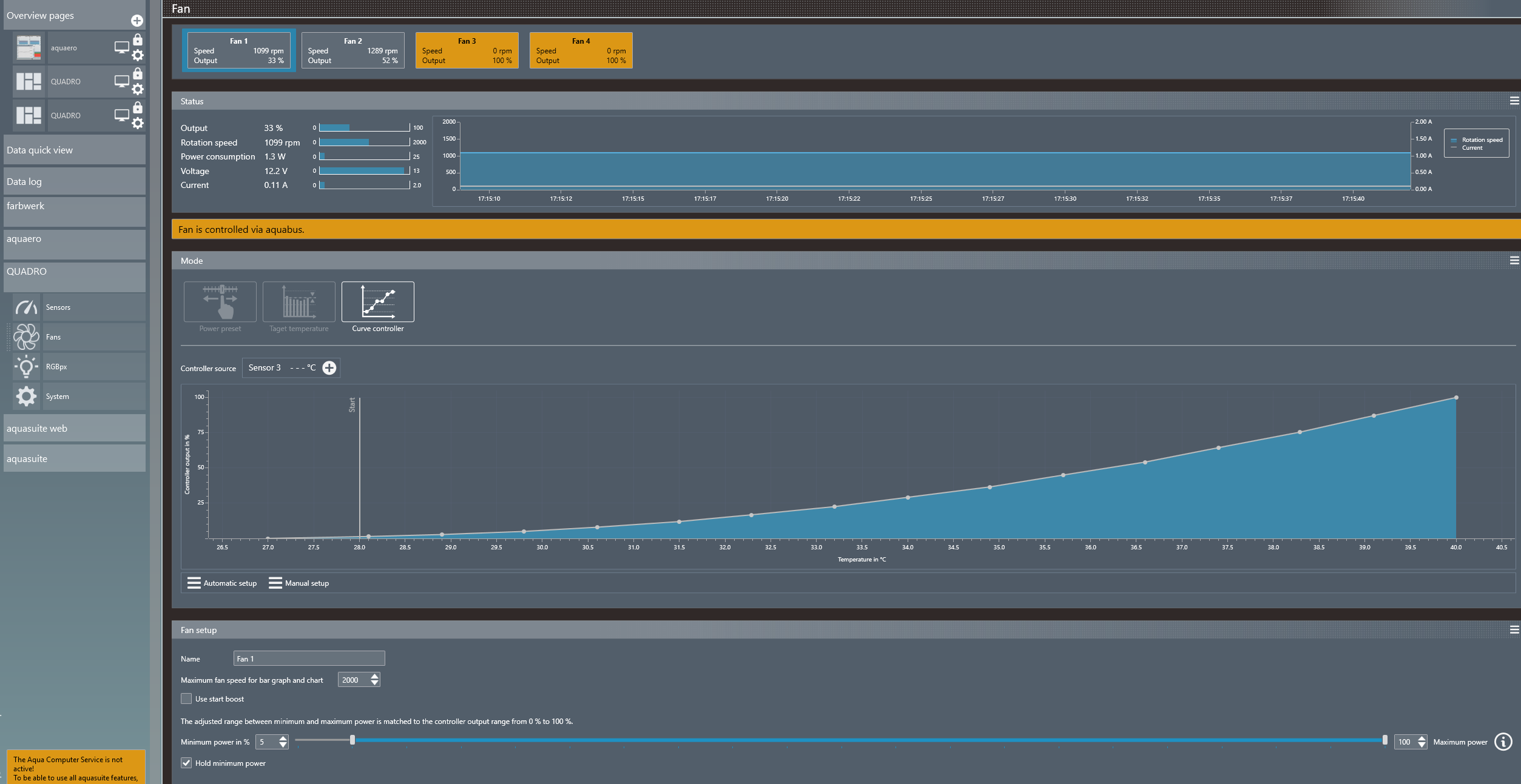 Each fan output can be configured individually. In addition to manual settings of the output power, automatic control is also possible. A setpoint controller with temperature setting and a curve controller are available. For the setpoint controller the desired temperature is being is set and the fan is controlled automatically as required. Experienced users can also optionally adjust the PID controller settings. The curve controller defines a power curve with temperature and power values via 16 freely adjustable points.