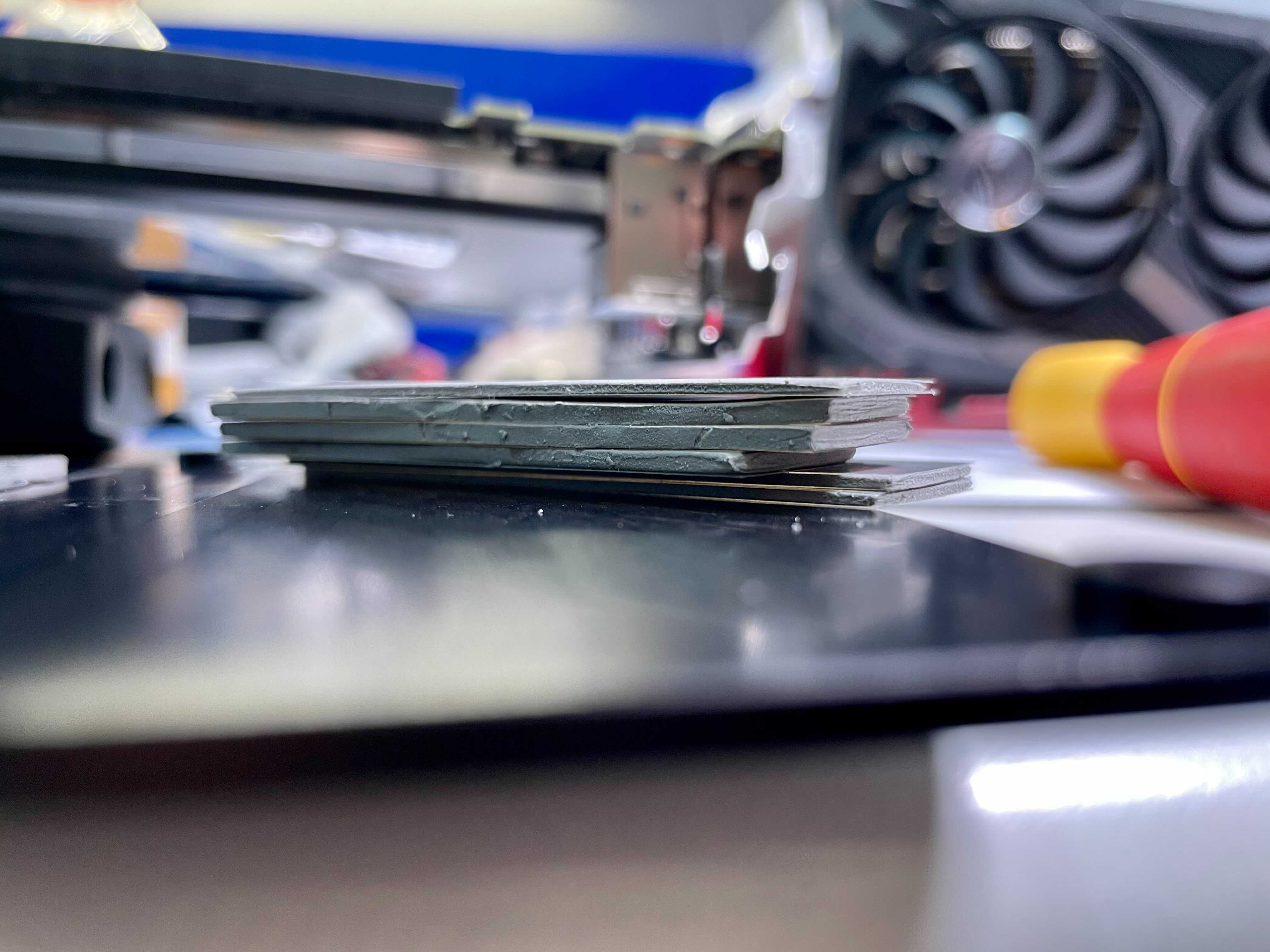 For the record, the thin ones (1mm) are the correct ones for the red areas. I checked with calipers, and the memory is 1.25mm tall and the backplate spacers are 2mm. This leaves a 0.75mm gap, which would be 25% compression on the 1.0mm thermal pads (the thinnest of the three) in the bag.